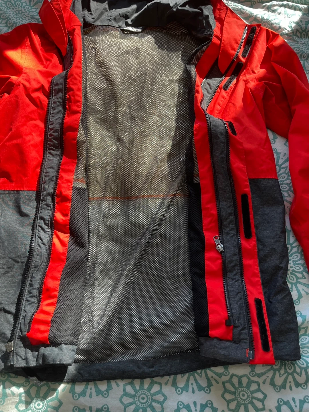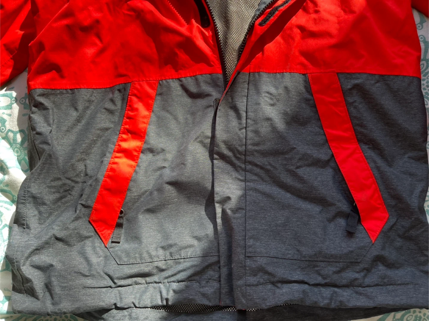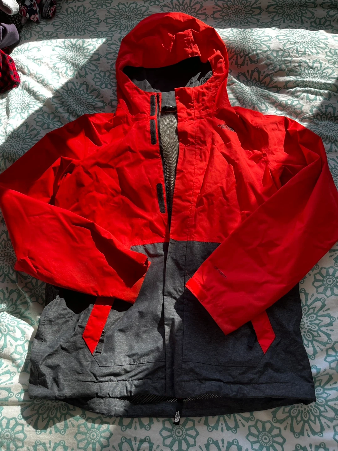 This is a boys' North Face jacket. It has the DryVent technology for water resistance. It's red and grey with a hood. Size is XL/TG.