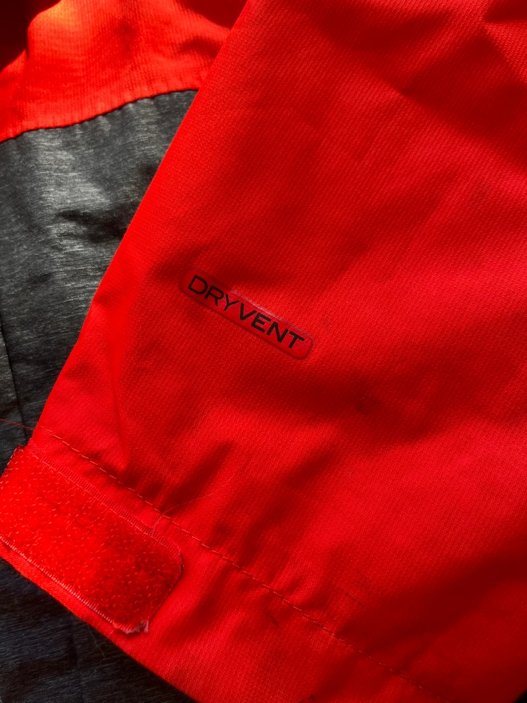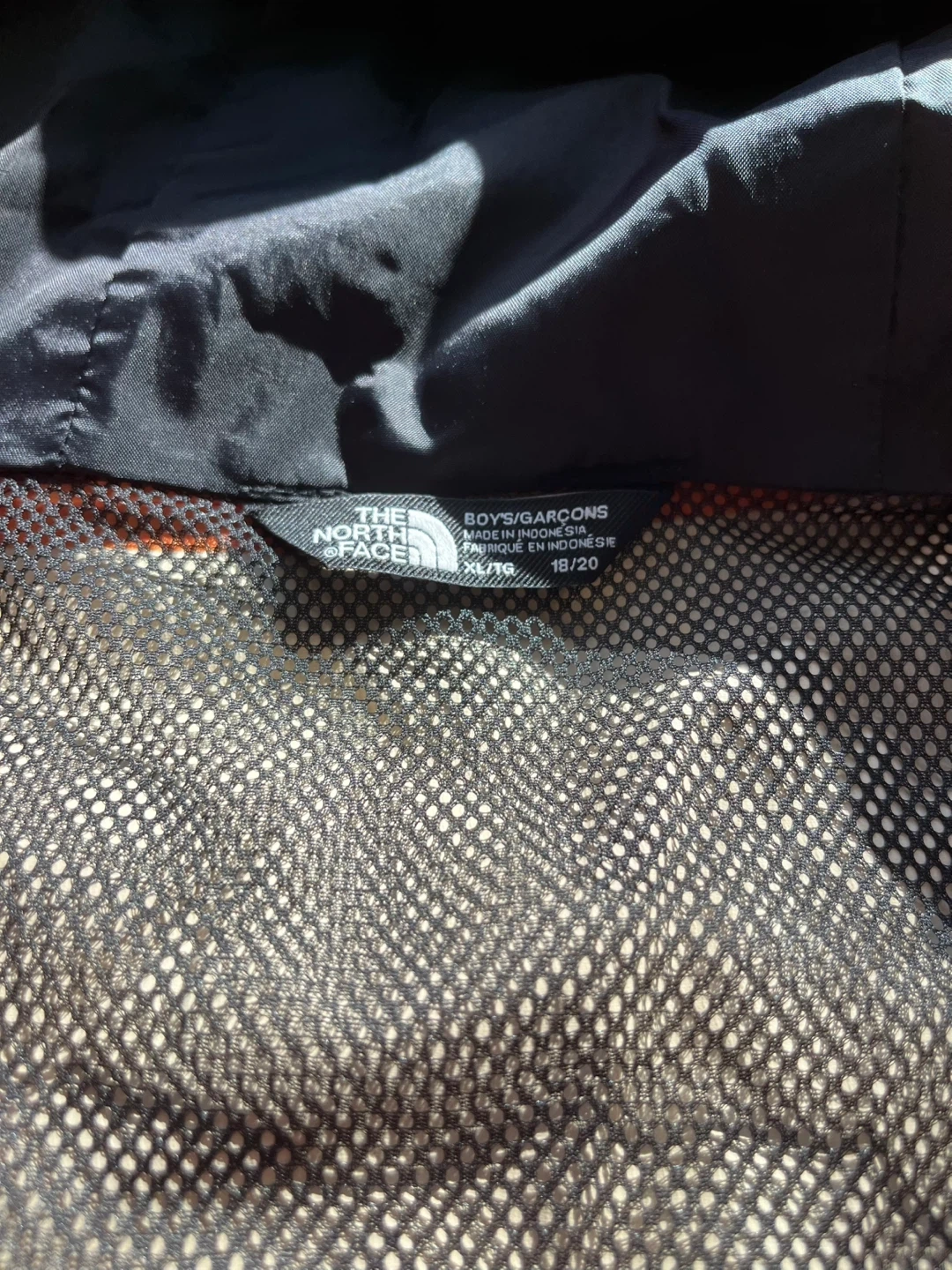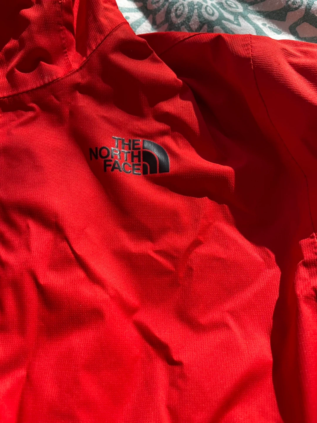 This is a boys' North Face jacket. It has the DryVent technology for water resistance. It's red and grey with a hood. Size is XL/TG.