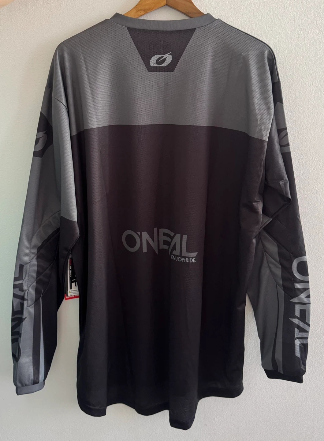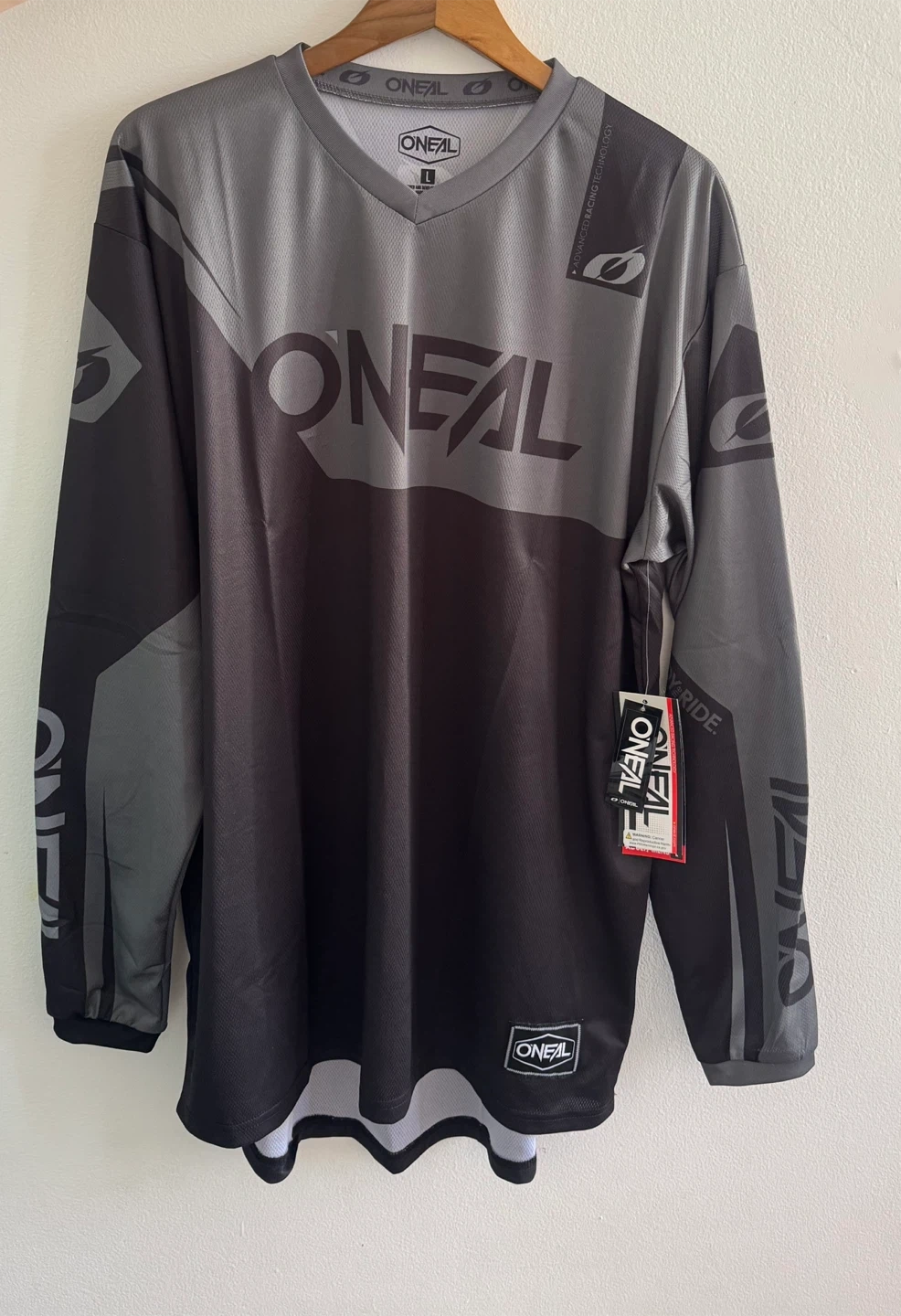 This is a ONEAL long sleeve motocross jersey. It's a size large. The jersey is grey and black with the ONEAL logo prominently displayed. Pickup only. Cash only.