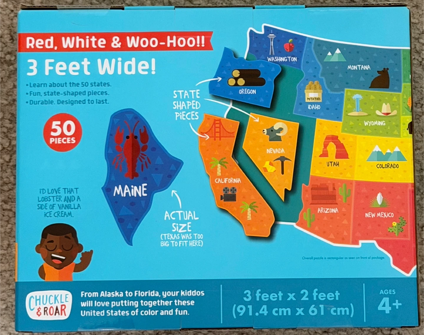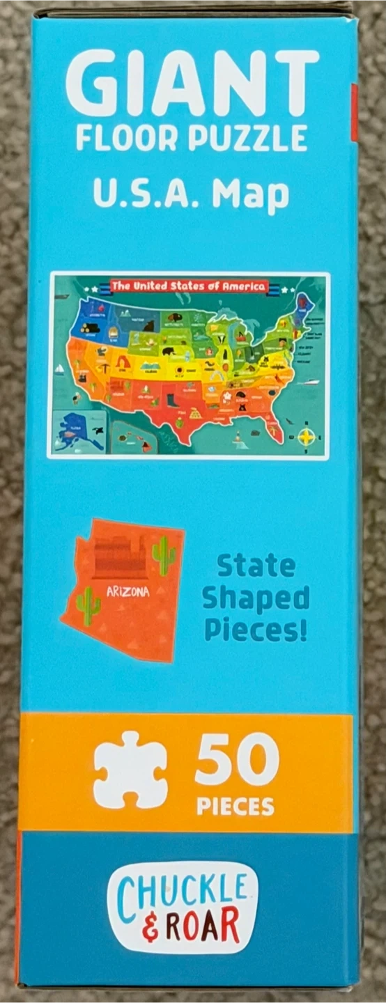 Selling a Chuckle & Roar Giant Floor Puzzle featuring the U.S.A. Map! It has 50 state-shaped pieces, making it a fun way for kiddos to learn about the 50 states. It's designed to be durable and last. The puzzle is 3 feet wide and 2 feet tall, and is recommended for ages 4+