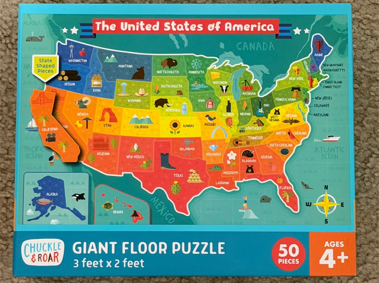 Selling a Chuckle & Roar Giant Floor Puzzle featuring the U.S.A. Map! It has 50 state-shaped pieces, making it a fun way for kiddos to learn about the 50 states. It's designed to be durable and last. The puzzle is 3 feet wide and 2 feet tall, and is recommended for ages 4+