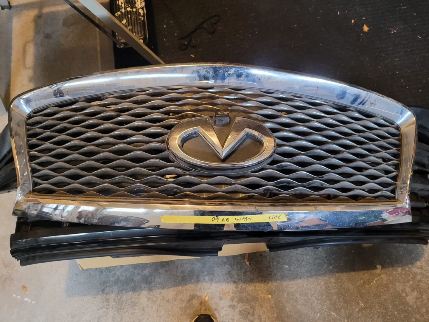 Genuine Infiniti front upper radiator grille removed from a 2017 QX60. This is the original factory part, not a low-quality aftermarket replacement.