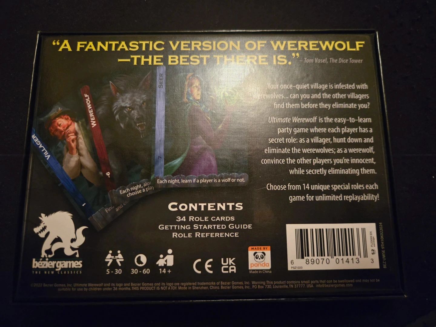 Selling the Ultimate Werewolf board game! It's the #1 party game for up to 30 players. The box includes 34 role cards and a getting started guide and role reference. Choose from 14 unique special roles each game for unlimited replayability