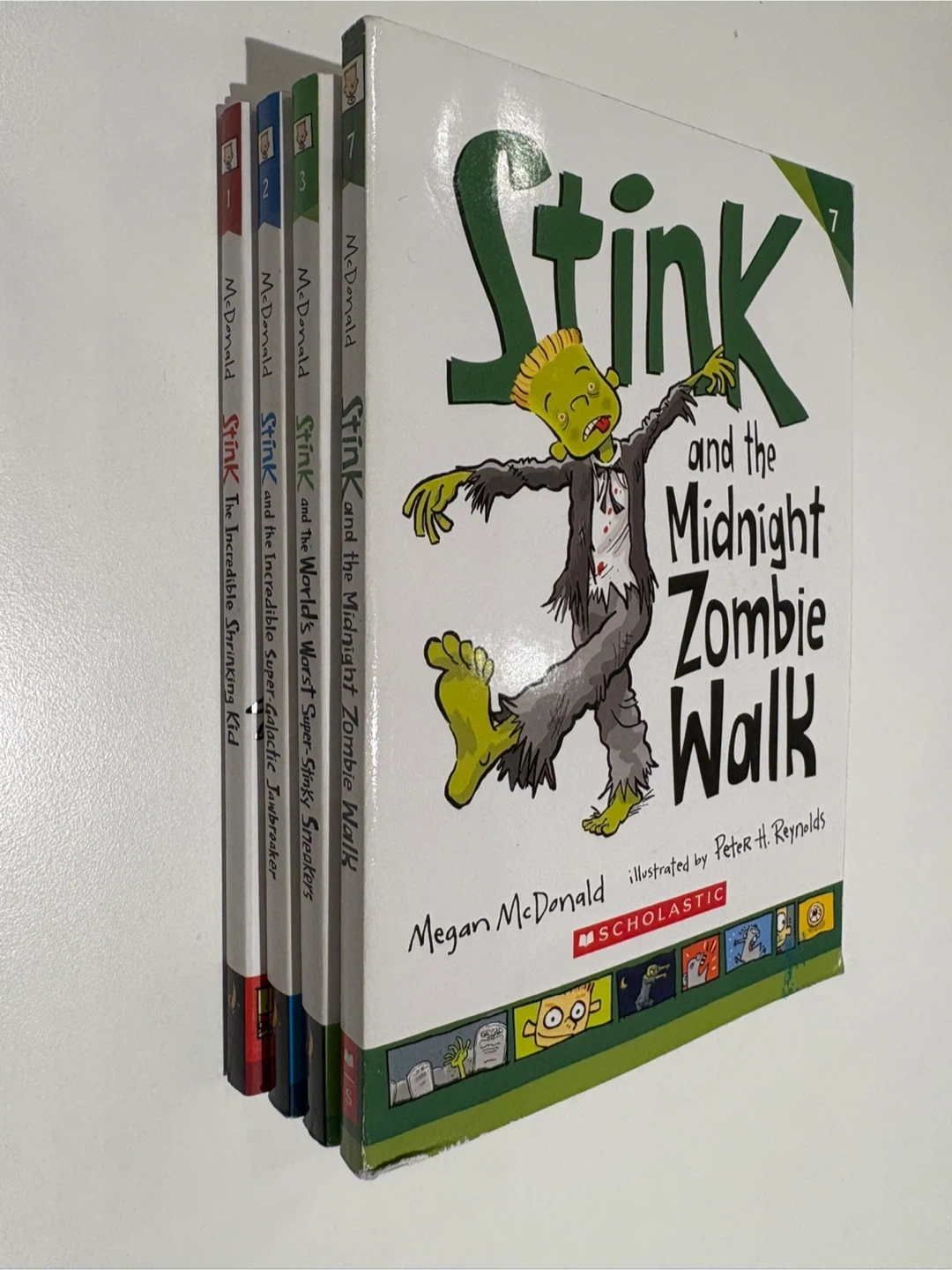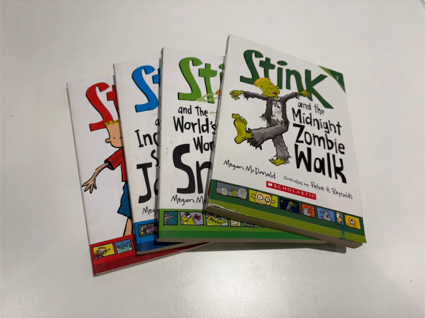 These are books from the “Stink” series by Megan McDonald, illustrated by Peter H. Reynolds, published by Candlewick / Scholastic.
