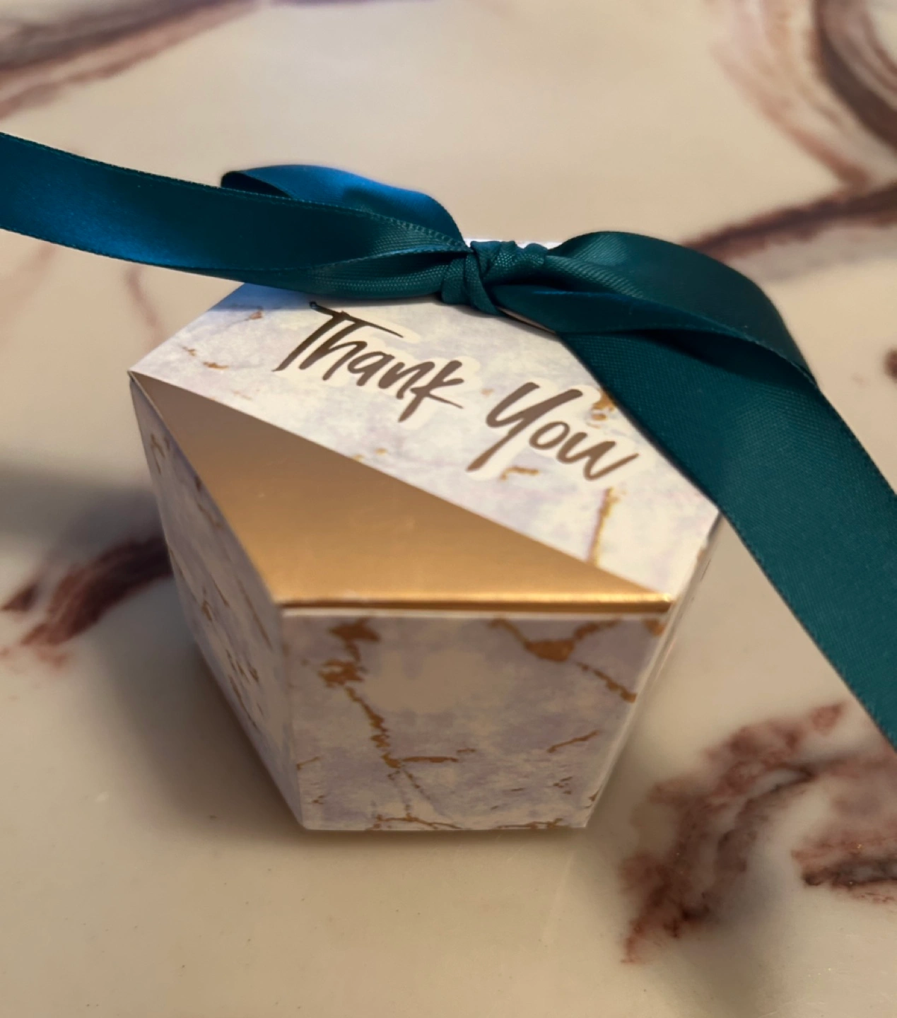 50 pieces of favour boxes. Hexagon shape. Marble print with gold accents. Teal ribbon included. Perfect for weddings, birthdays, or other celebrations. Approximately 2 inches tall.