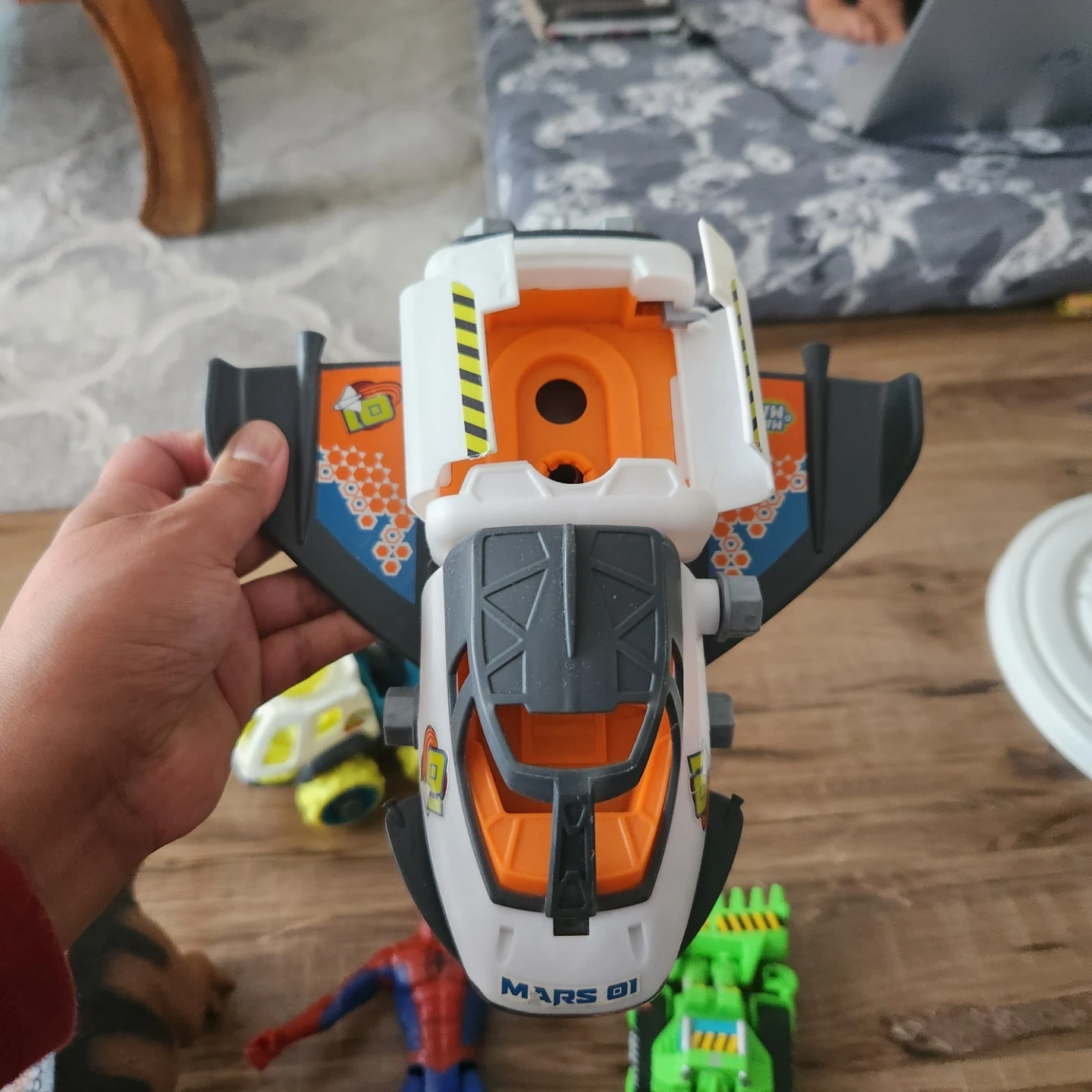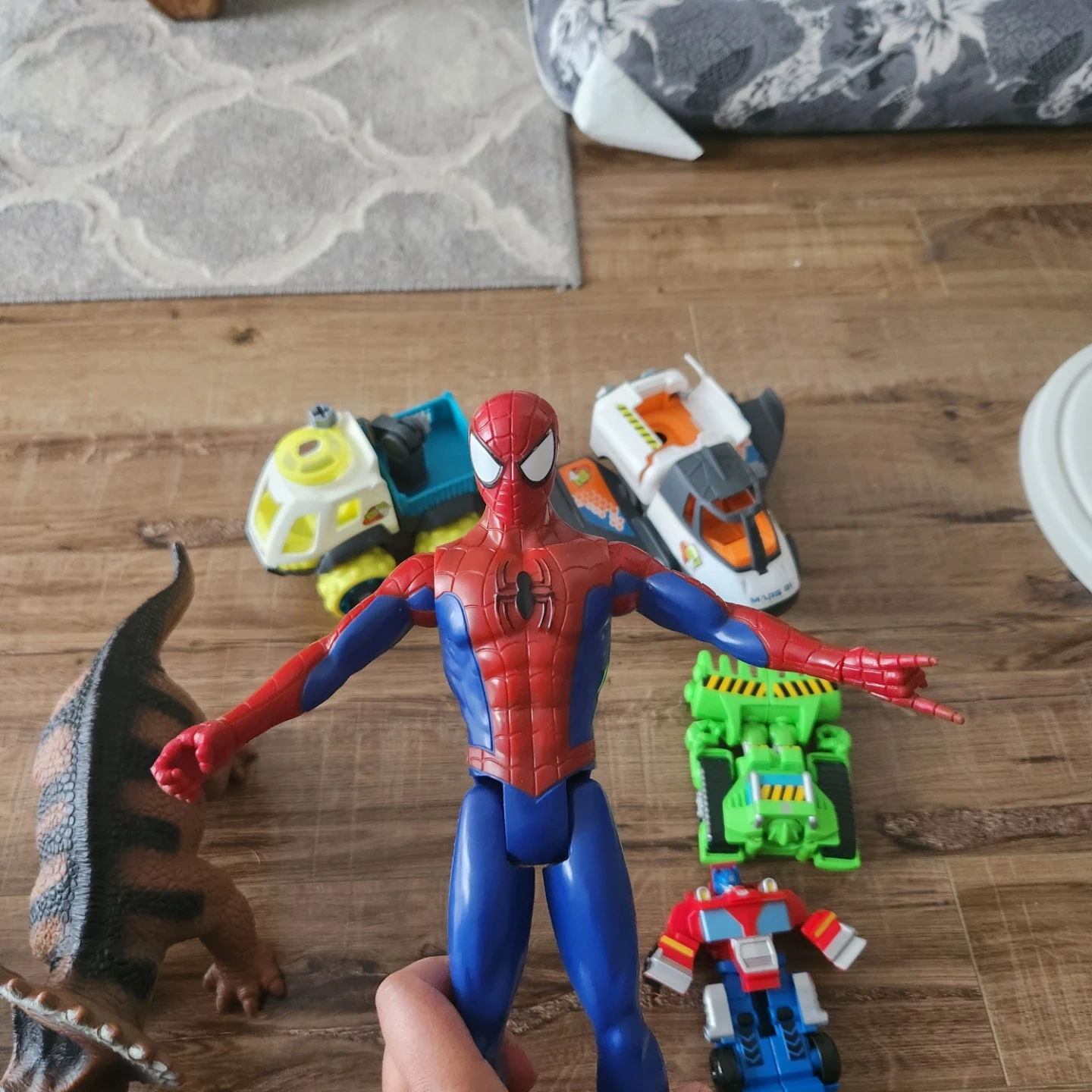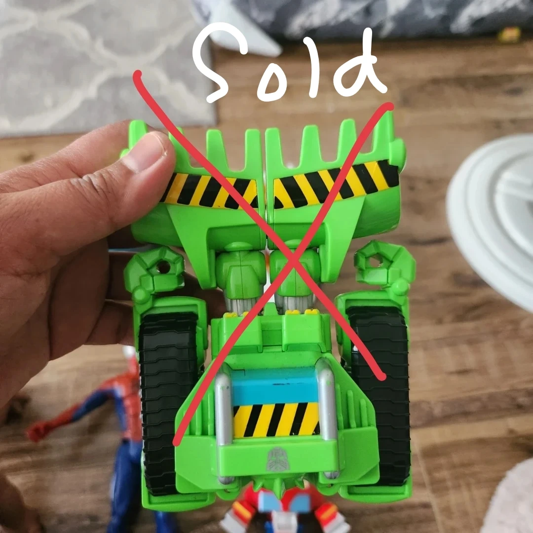 Selling a mixed lot of toy vehicles and an action figure. Includes a red and blue robot toy, a white and yellow truck, a white and orange space shuttle, a green tractor toy, and a Spiderman action figure. Great for kids!