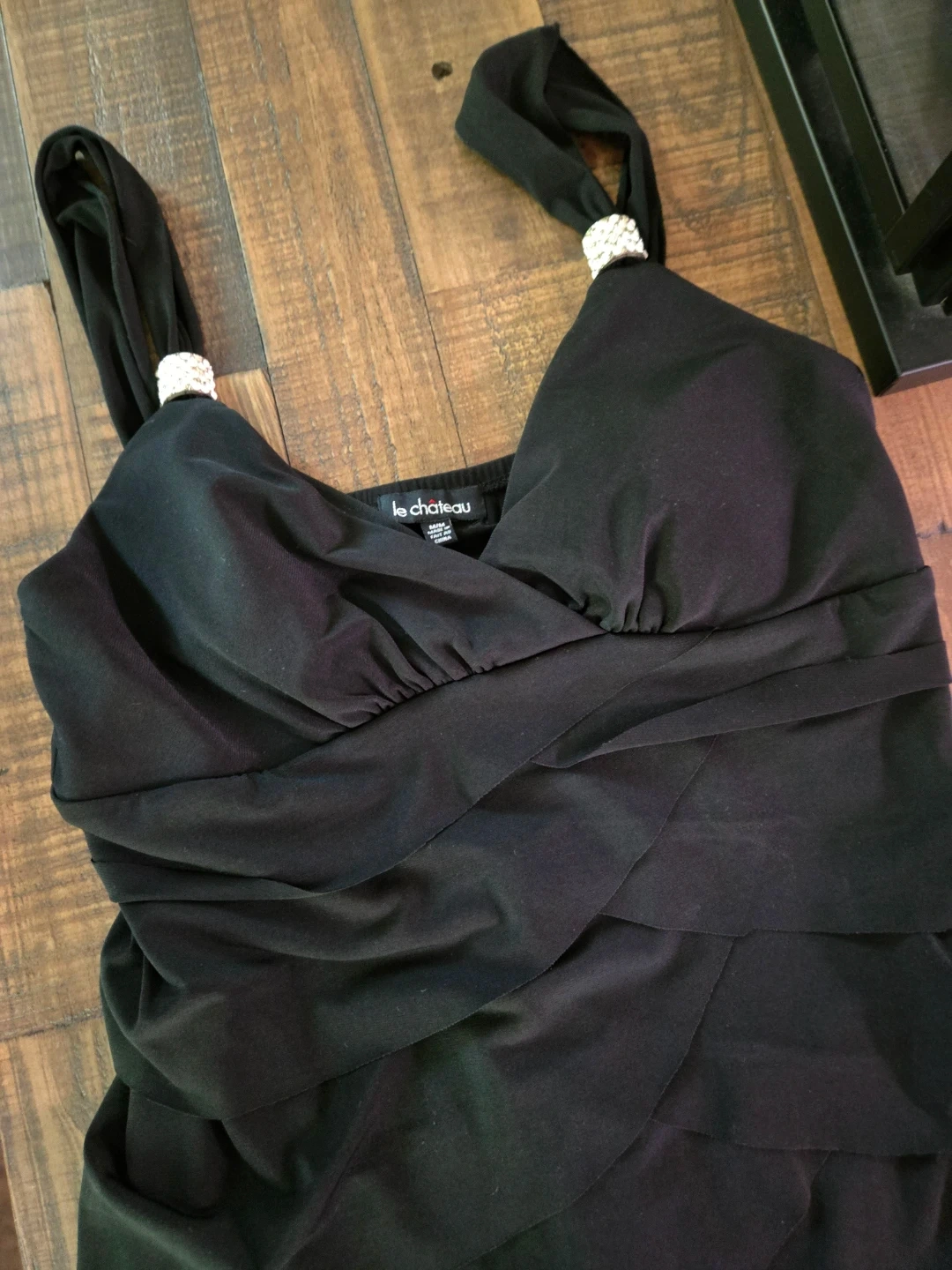 This Le Château black dress features a tiered ruffle design with jewelled strap accents. It's a stylish option for any occasion. Made with a stretchy fabric for a comfortable fit.