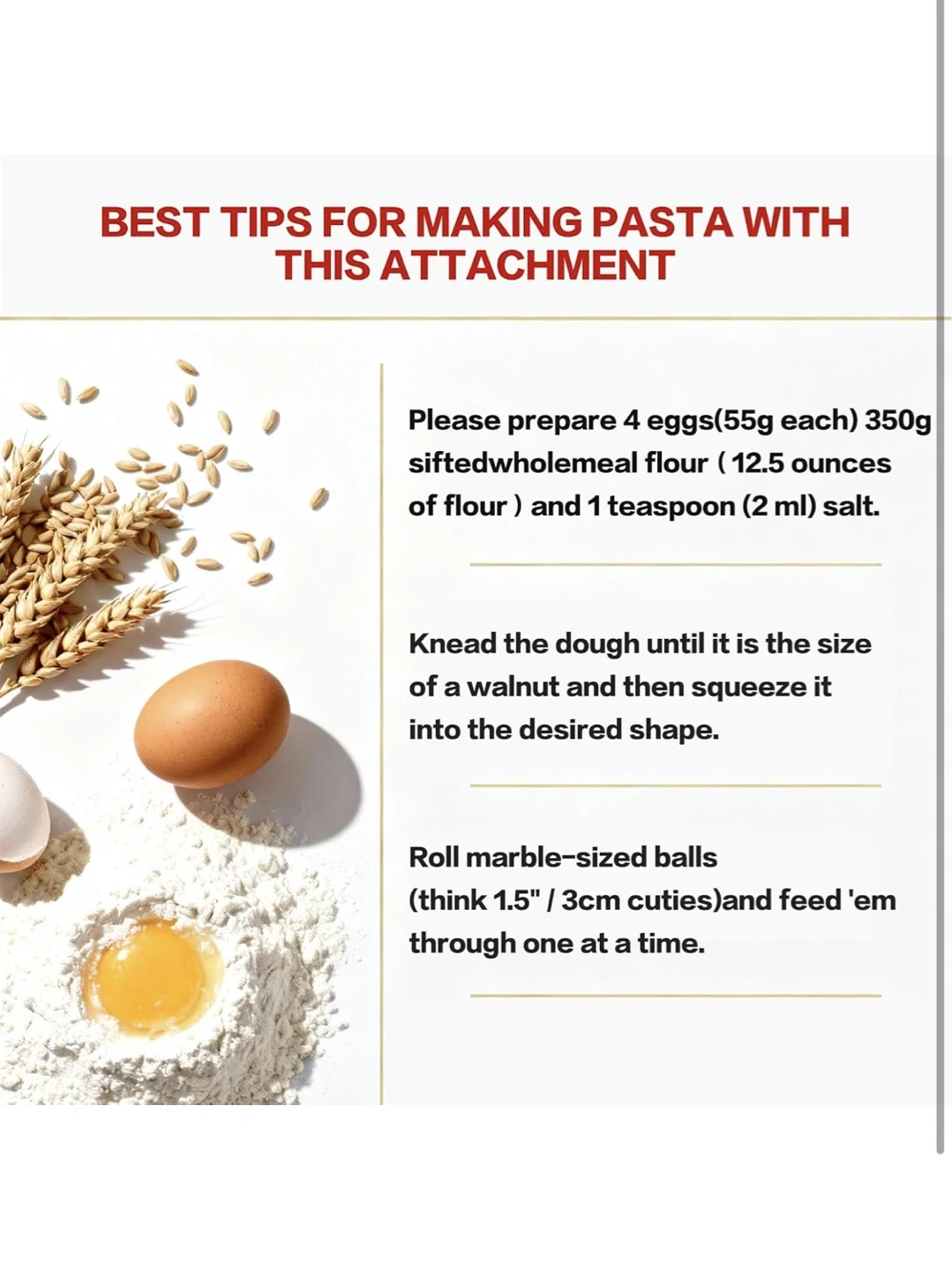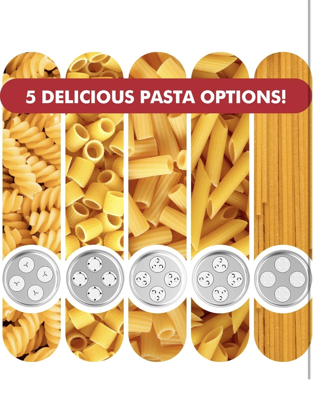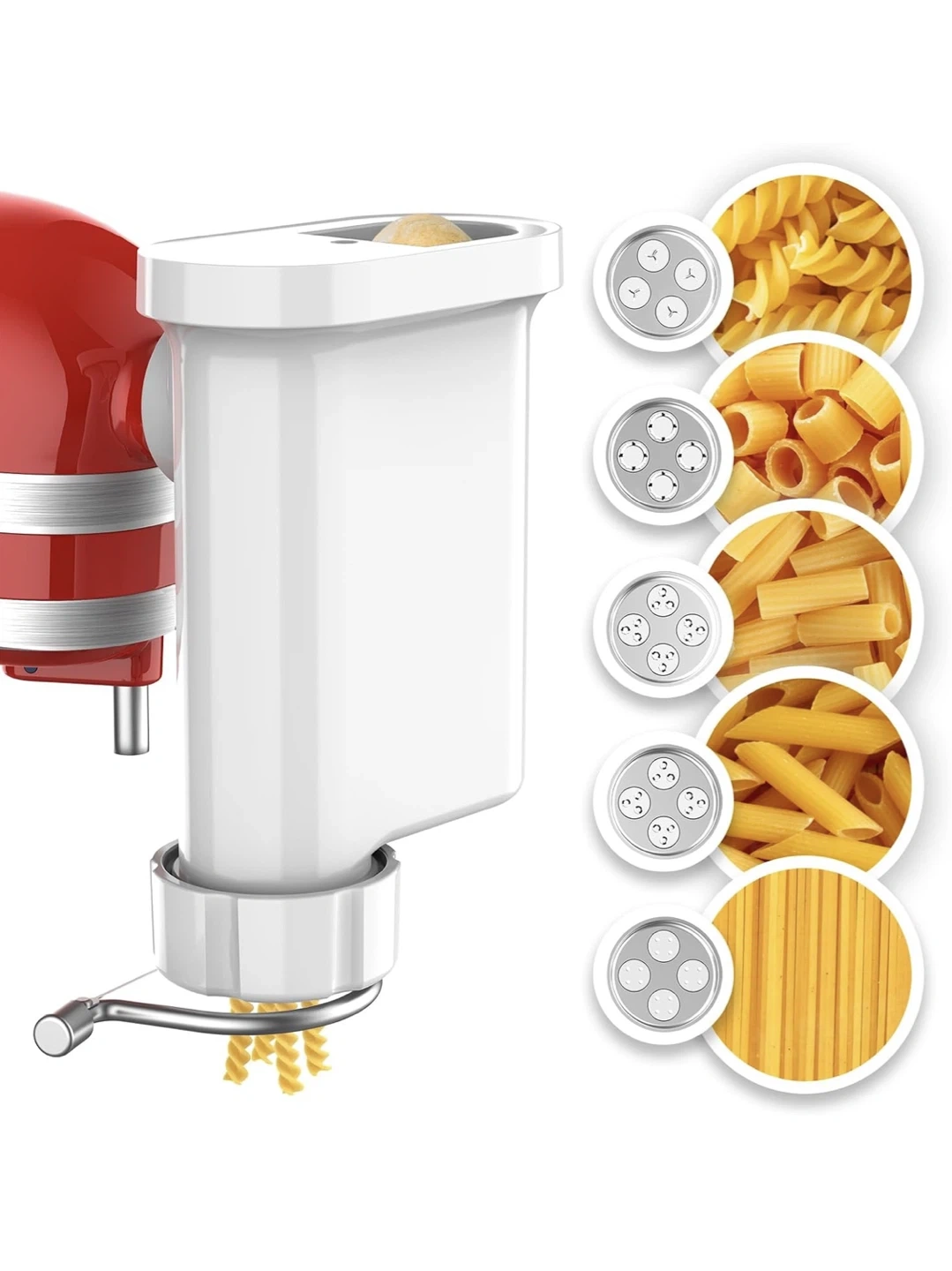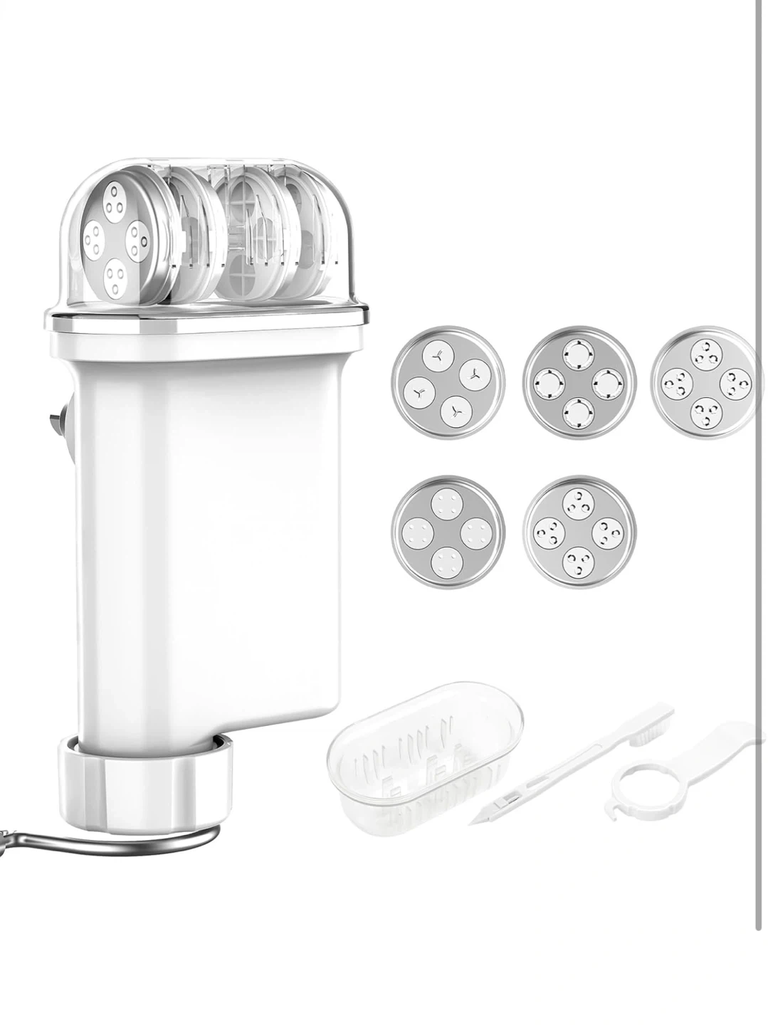 This attachment lets you create all your favourite pasta shapes at home! Includes multiple dies for different pasta types and a cleaning brush. Easily makes spaghetti, penne, fusilli, and more.