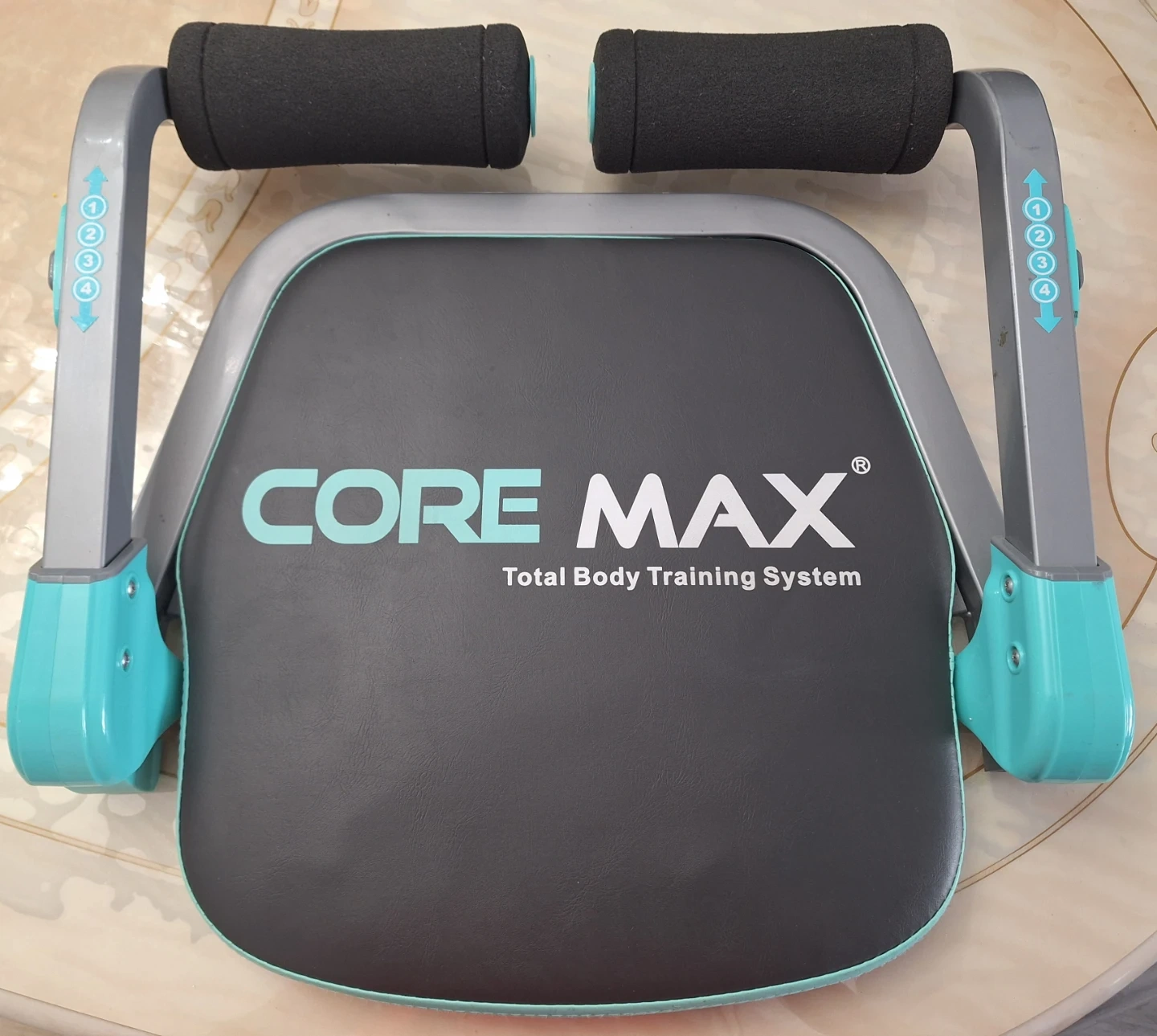 This is the Core Max Total Body Training System. It has padded handles and a cushioned seat. This equipment offers multiple resistance levels (4 levels).