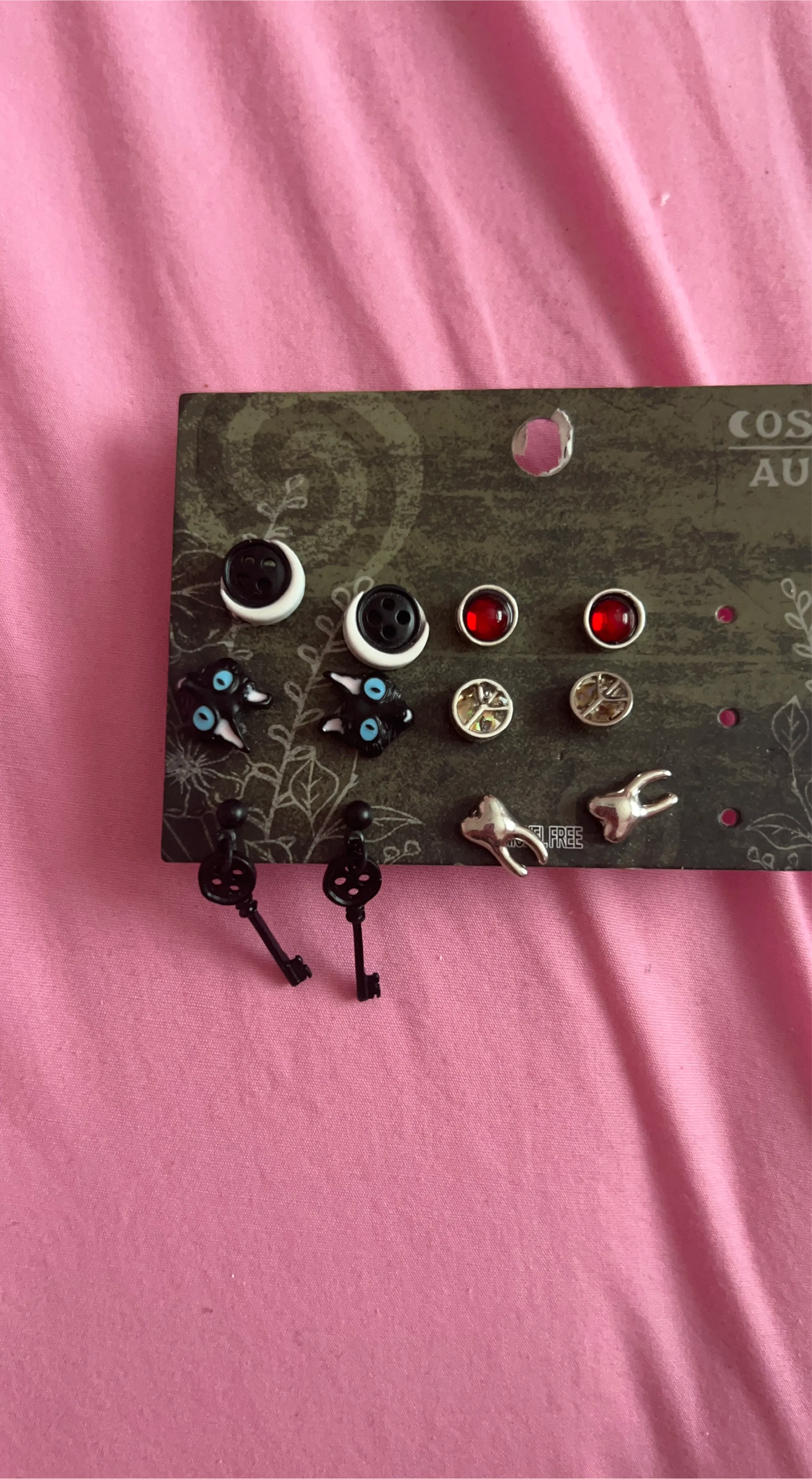 This set includes a variety of unique stud earrings. You'll find designs like keys, teeth, peace signs, and cat eyes. It's a fun collection for adding a bit of personality to your look!