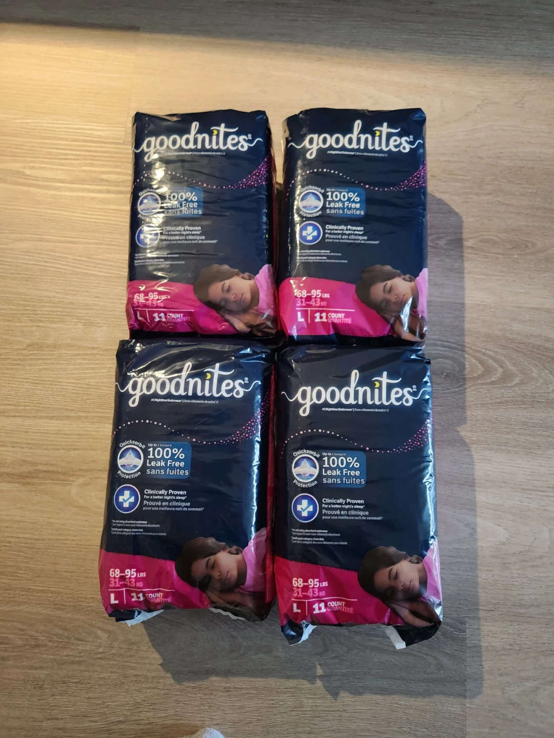 Four packs of GoodNites size L underwear. Each pack contains 11 counts for a total of 44. They offer 100% leak-free protection and are clinically proven for a better night's sleep. Designed for children weighing 68-95 lbs (31-43 kg).