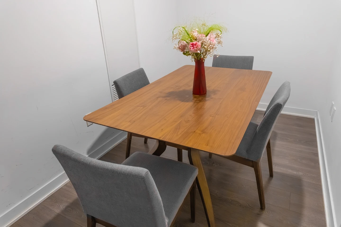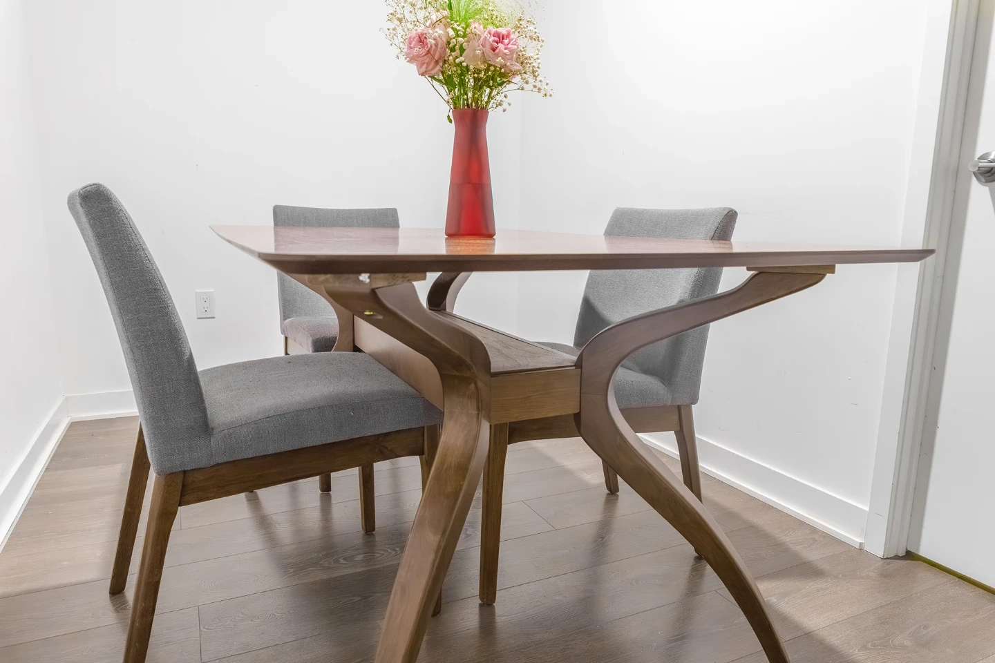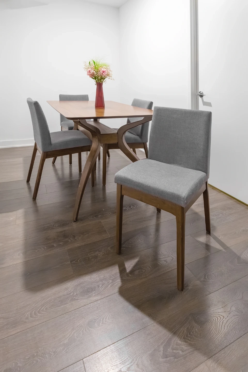 Luxury solid wood dining table with a warm walnut finish. It's paired with four upholstered chairs in an elegant neutral grey fabric. The table's unique leg design adds a stylish touch to any dining space. Seats four comfortably.