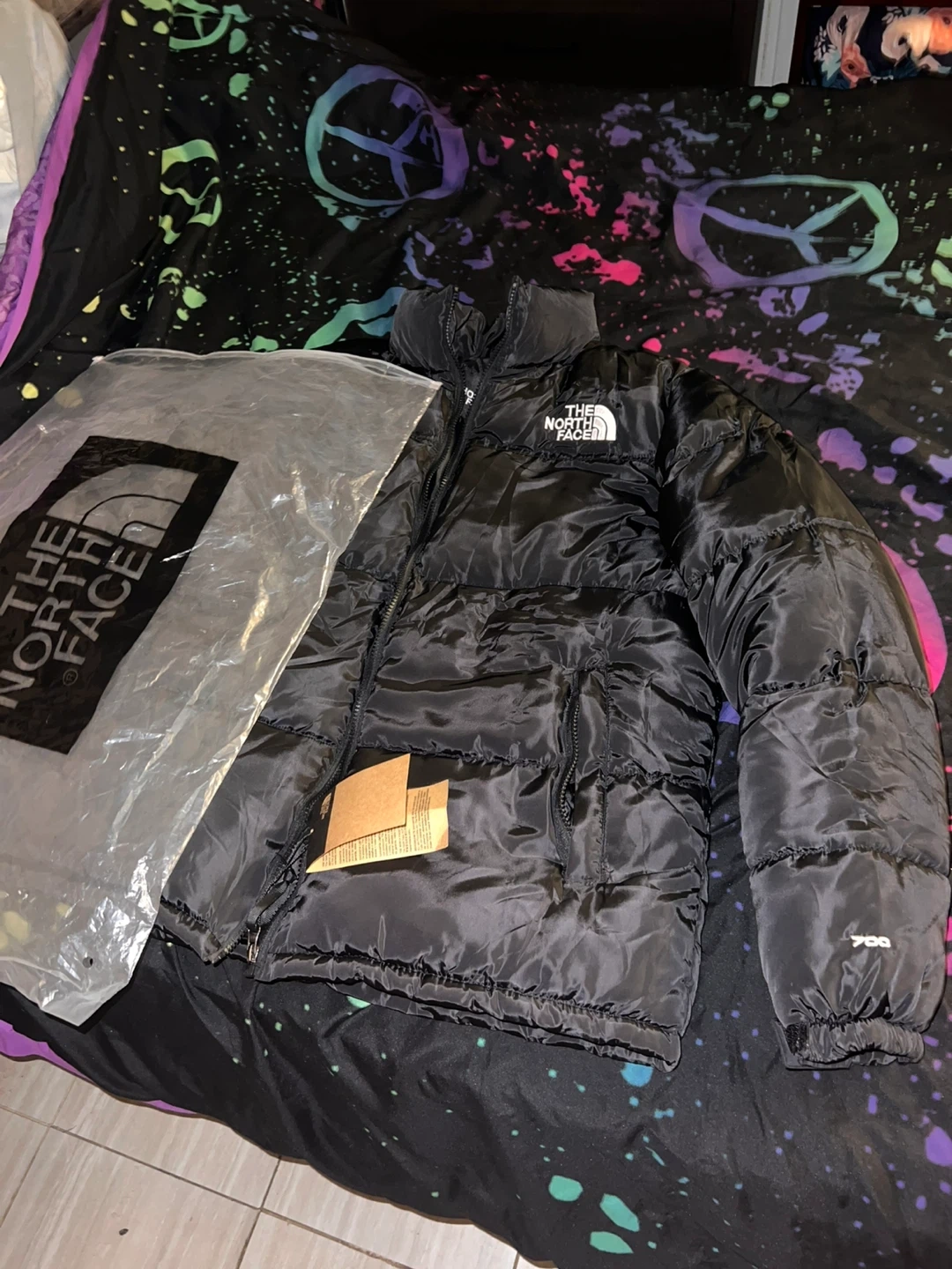 This is a black puffer jacket from The North Face. It has a shiny finish and a hooded design. The jacket includes tags and original packaging.