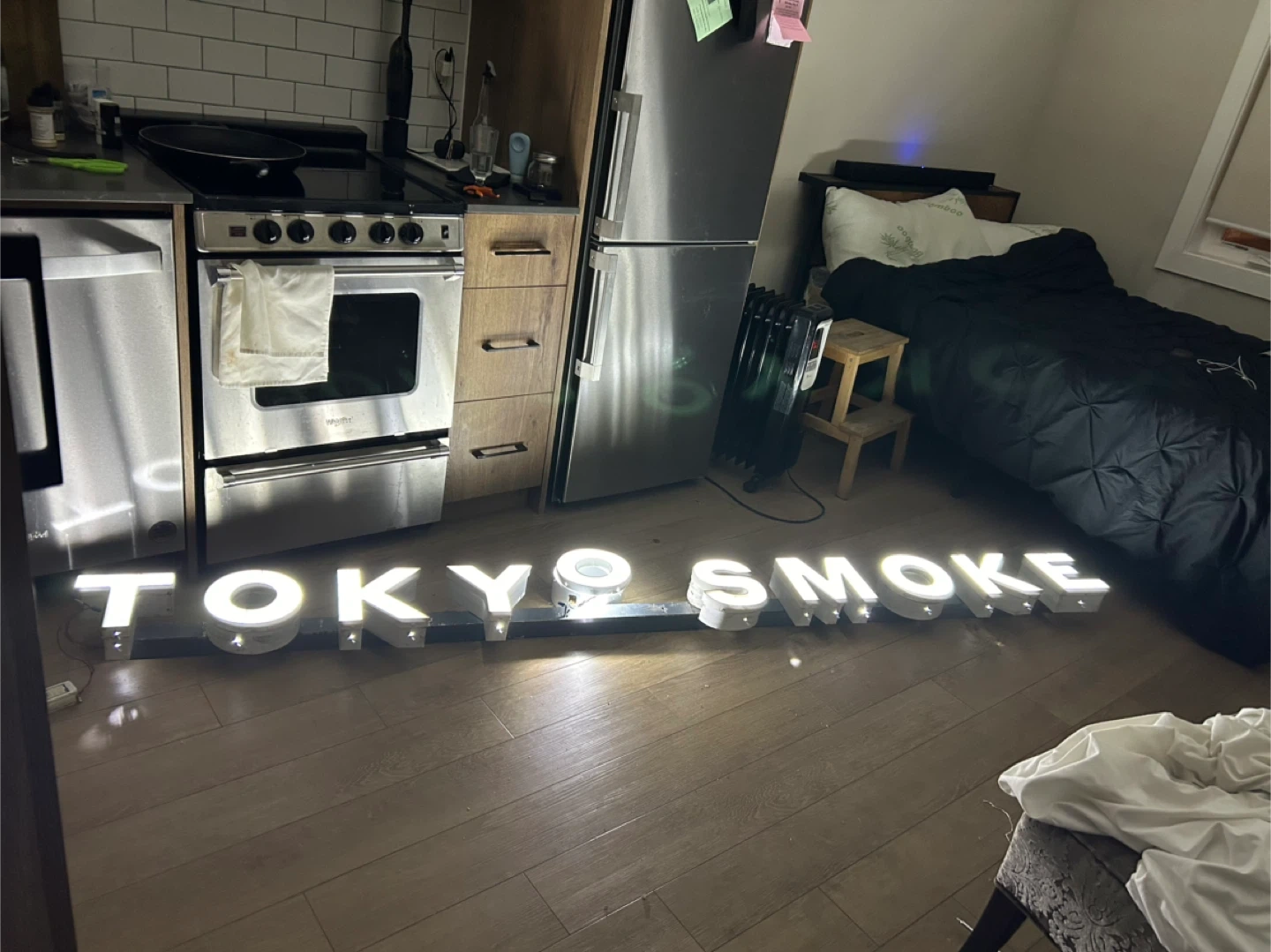 Illuminated sign spelling out "Tokyo Smoke". It's made of individual white LED letters mounted on a black metal frame. Great for business or personal display!