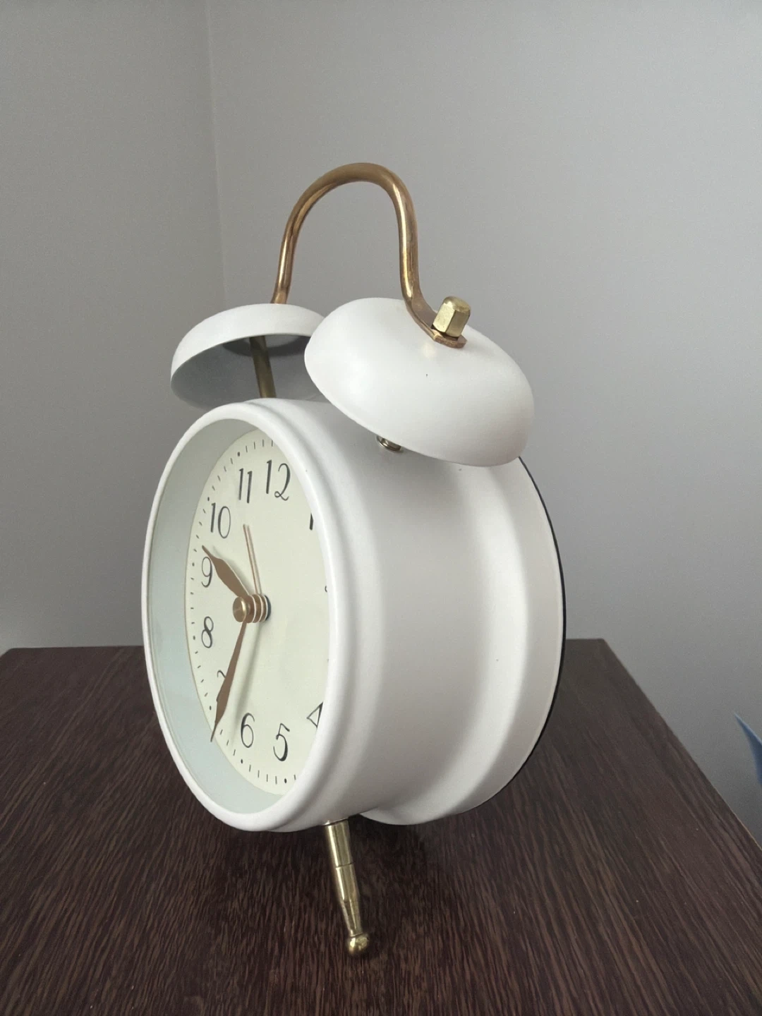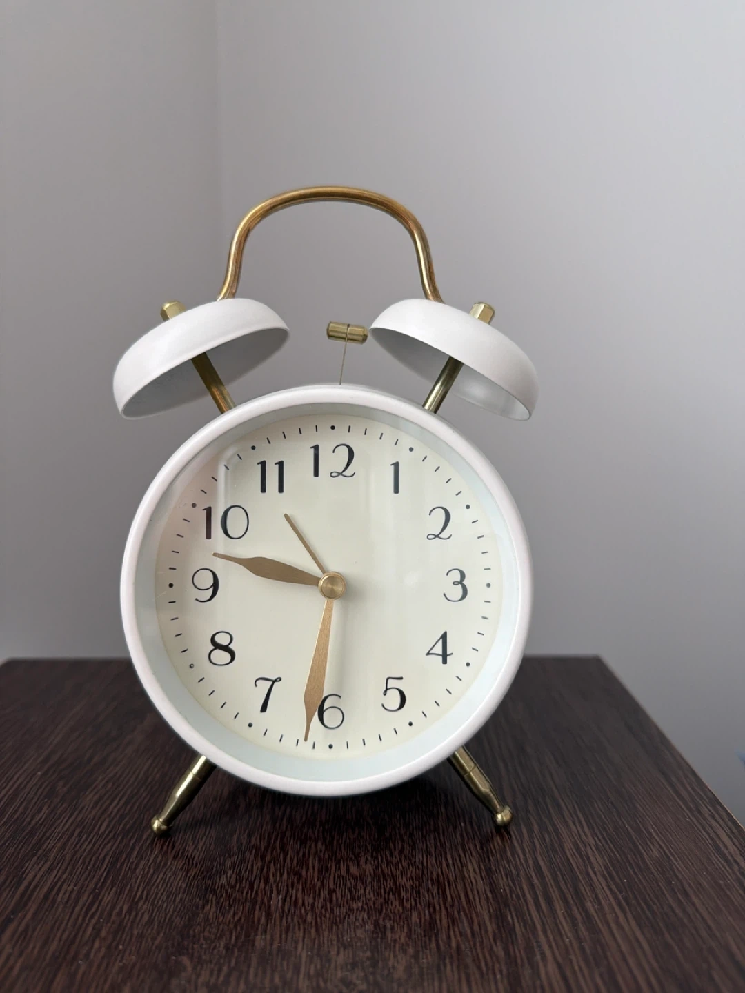 Classic white twin bell alarm clock. It has a metal casing with gold accents. It's battery-operated and features a quartz movement for accurate timekeeping. Keeps time well!