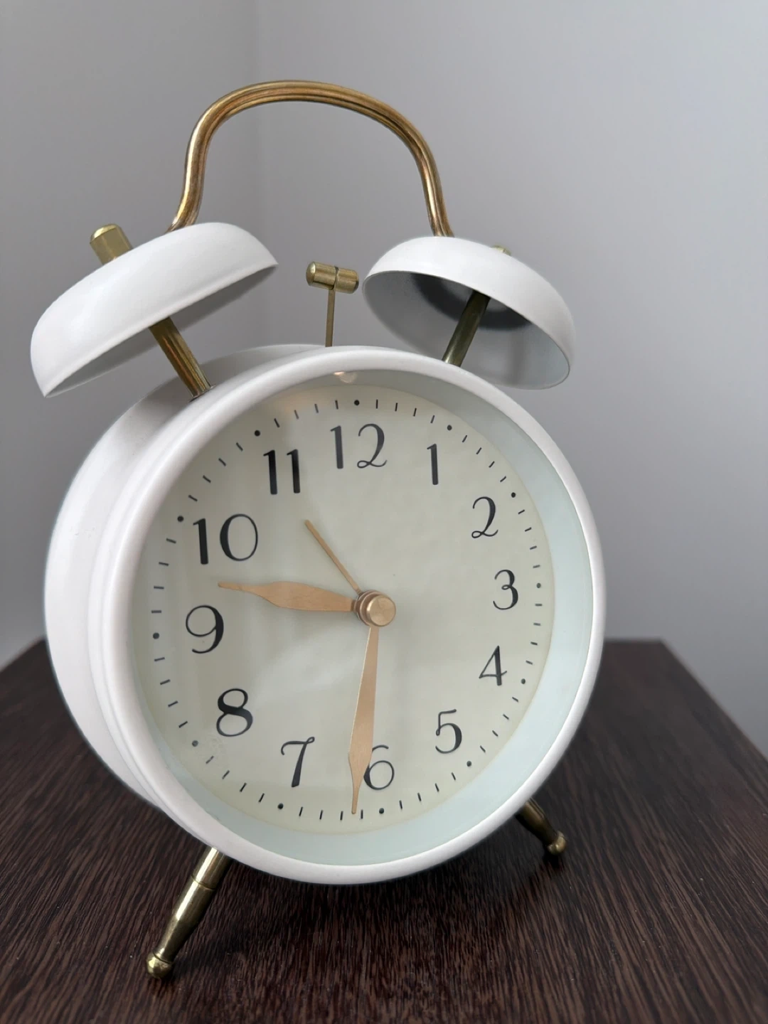 Classic white twin bell alarm clock. It has a metal casing with gold accents. It's battery-operated and features a quartz movement for accurate timekeeping. Keeps time well!