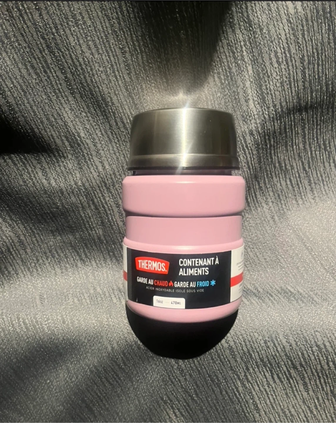 This is a Thermos food jar container in pink. It holds 16oz or 470ml. It's designed to keep food hot or cold for hours. This container is great for packing lunches or taking meals on the go!