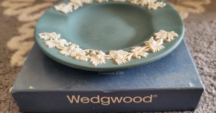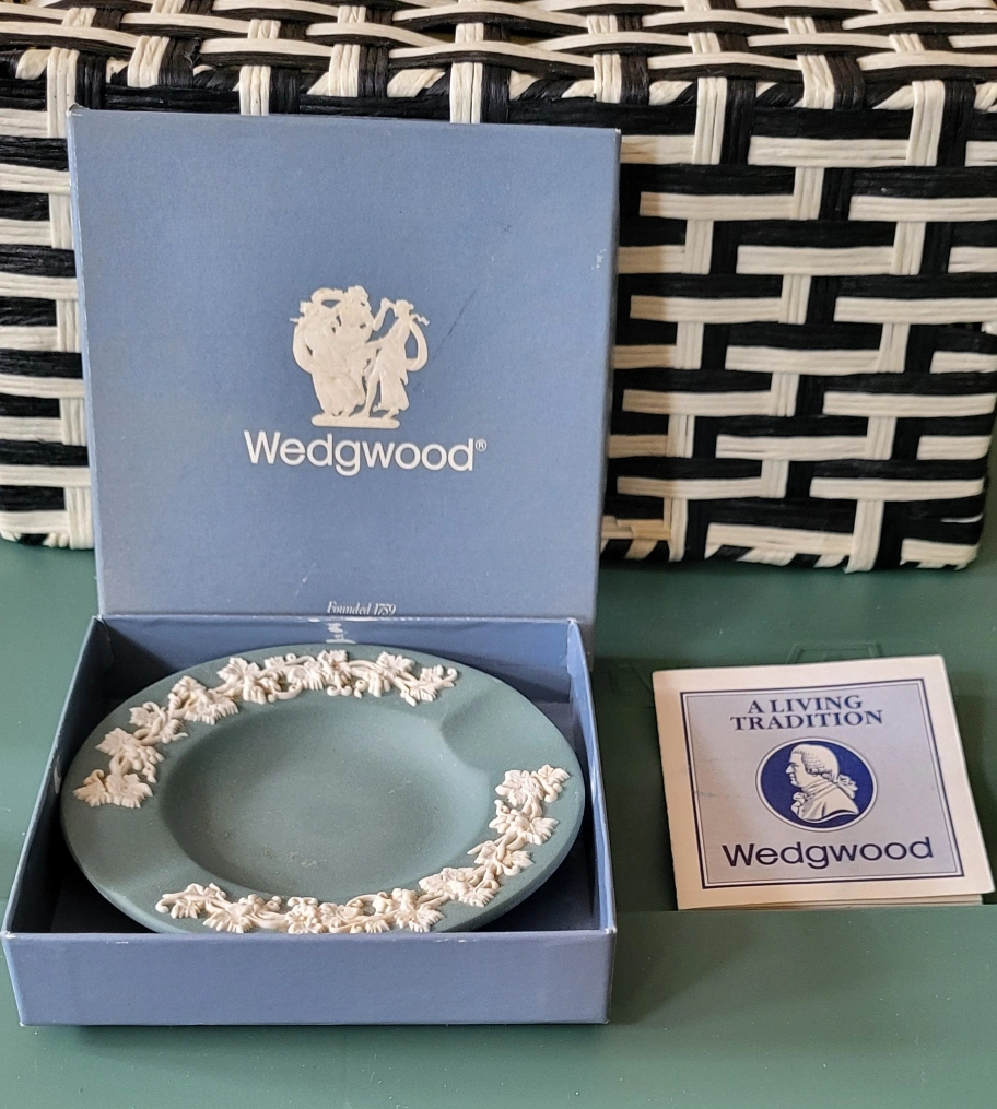 A small Wedgwood ashtray in its original box. It is made of a green coloured Jasperware and is decorated with a white vine design around the outer rim. The ashtray has aCollectibles