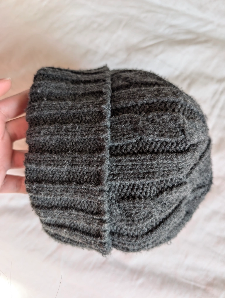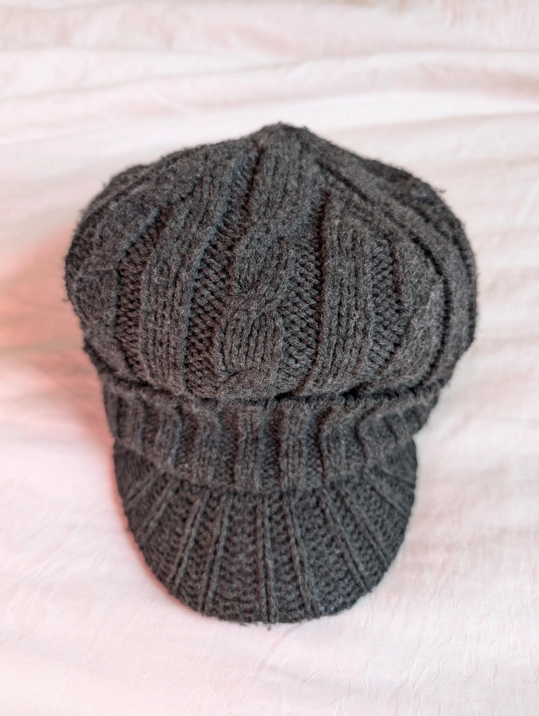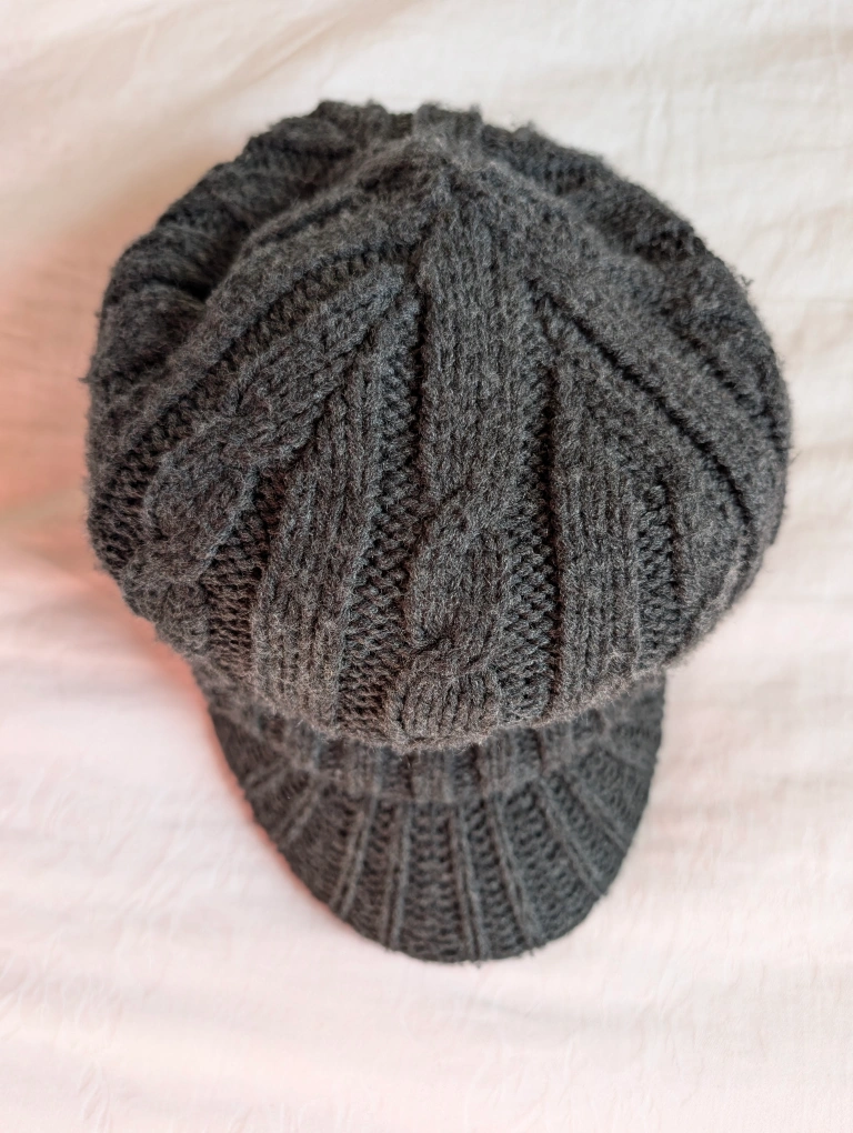 Grey cable knit hat with a visor. It has a thick knit and is in good condition. Would be great for a sunny winter day. Unisex