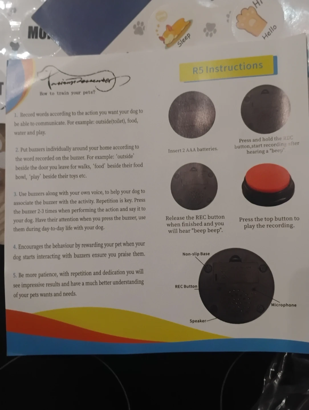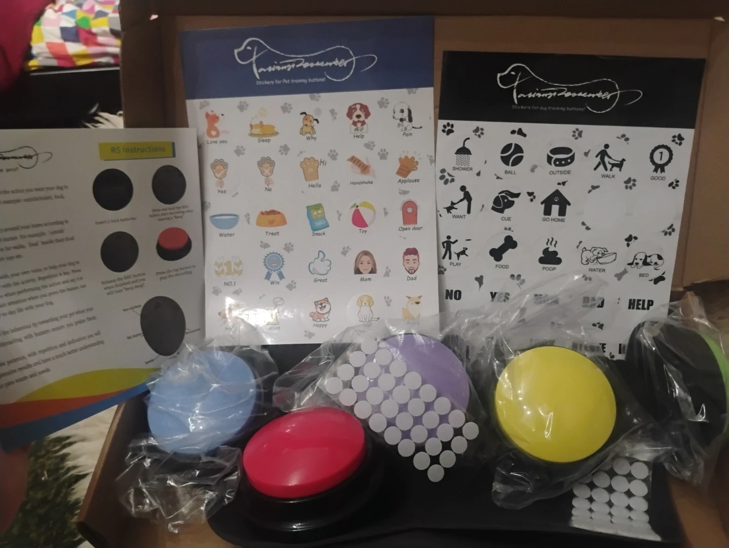 This set includes pet training buttons and various stickers for communication. It comes with multiple coloured buttons and a variety of stickers featuring words and icons for training. Also includes instructions and adhesive dots.