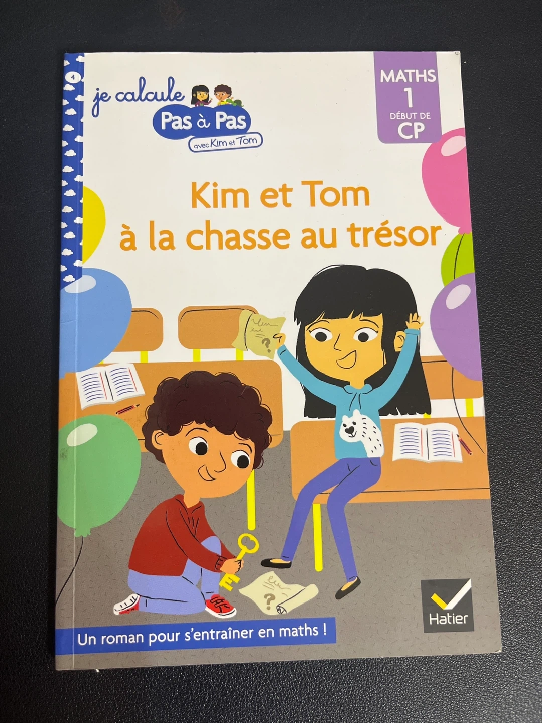 This is the 'Kim et Tom à la chasse au trésor' workbook by Hatier. It's part of the Maths 1 series for early CP. The book contains activities for practising math skills.