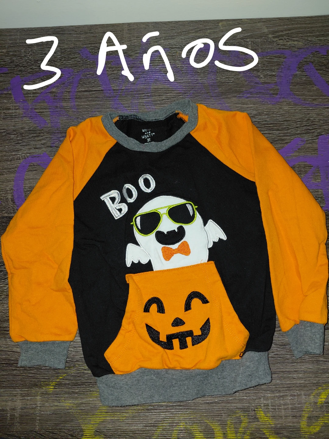 I'm selling a Wills and Wyatt Halloween shirt in size 3T. It features a ghost with sunglasses and a pumpkin design. Perfect for the spooky season!
