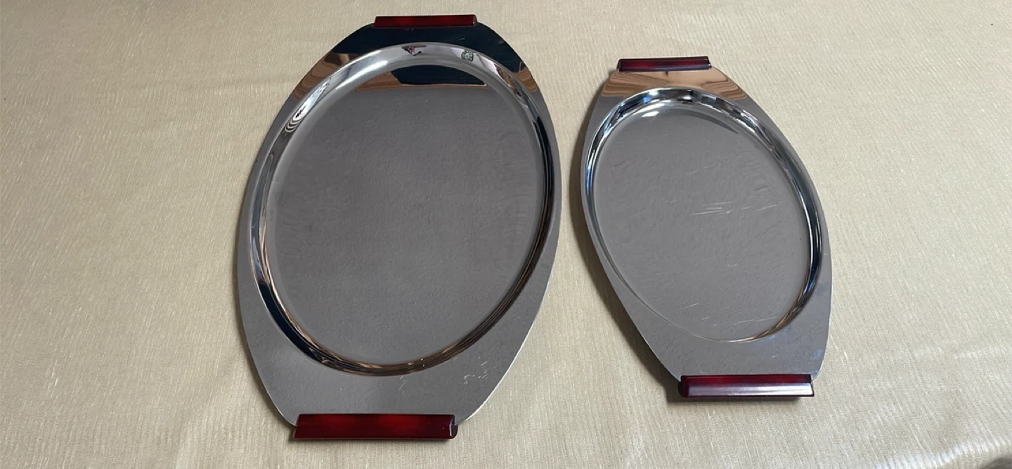 This set includes two oval serving platters. They feature a shiny silver-toned metal construction and dark red, rectangular handles on each end. Perfect for serving appetizers or snacks at a gathering!