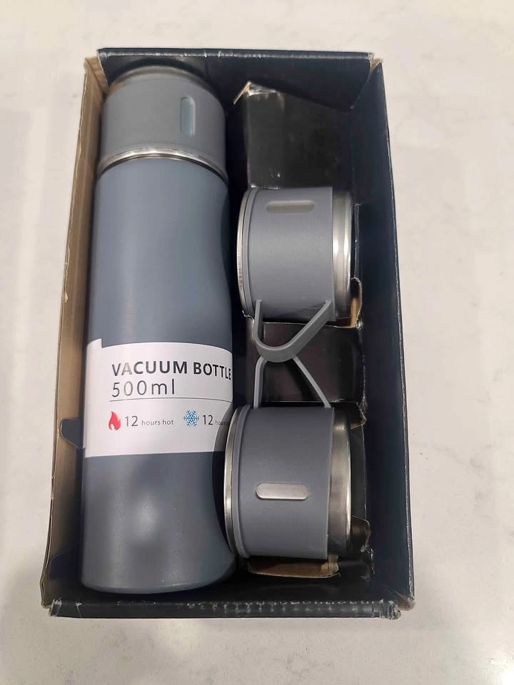 Selling a vacuum flask set in excellent condition. Perfect for keeping tea, coffee, or hot water warm for long hours. Includes 3 small stainless steel cups with handles. Compact and great for travel, picnics, or camping.