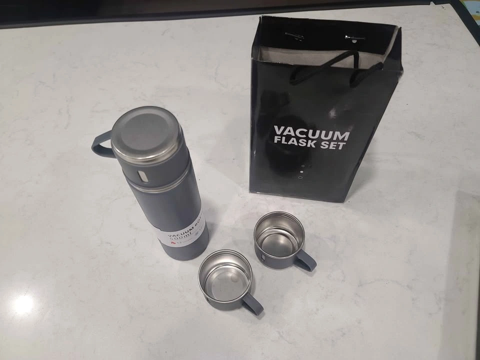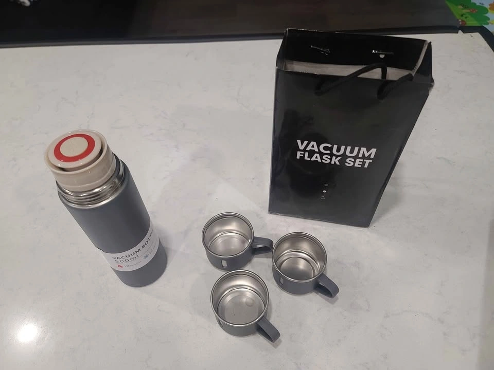 Selling a vacuum flask set in excellent condition. Perfect for keeping tea, coffee, or hot water warm for long hours. Includes 3 small stainless steel cups with handles. Compact and great for travel, picnics, or camping.