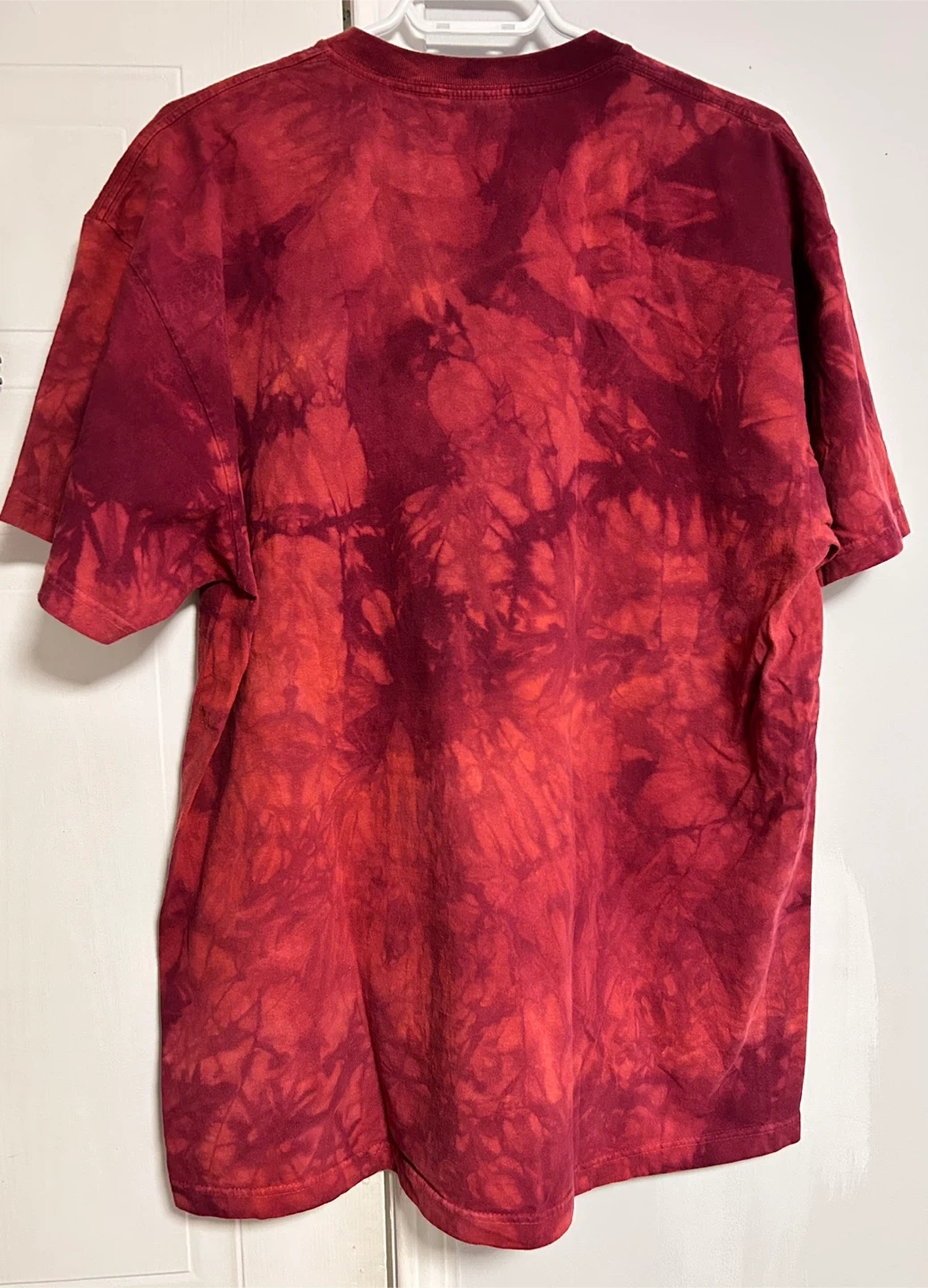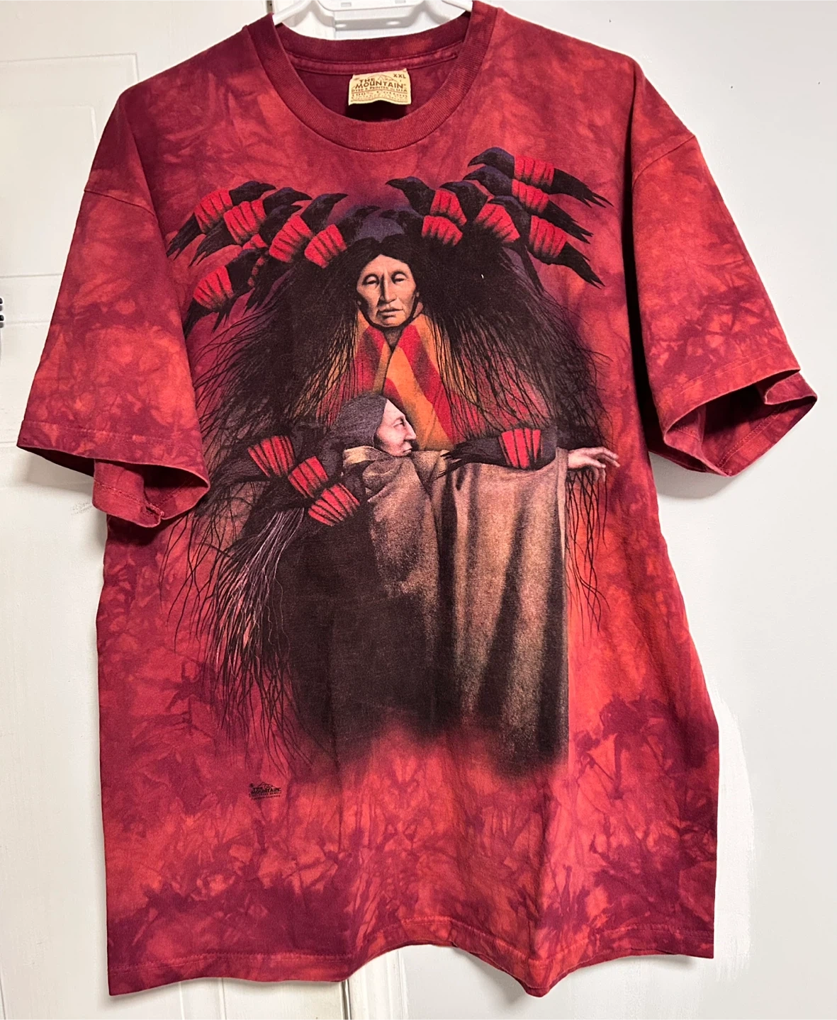 This is a size XXL t-shirt from The Mountain. It's made of 100% cotton and was dyed and printed in the USA. The shirt features a unique tie-dye pattern and a graphic print on the front. It's machine washable in cold water and can be tumble dried on medium.
