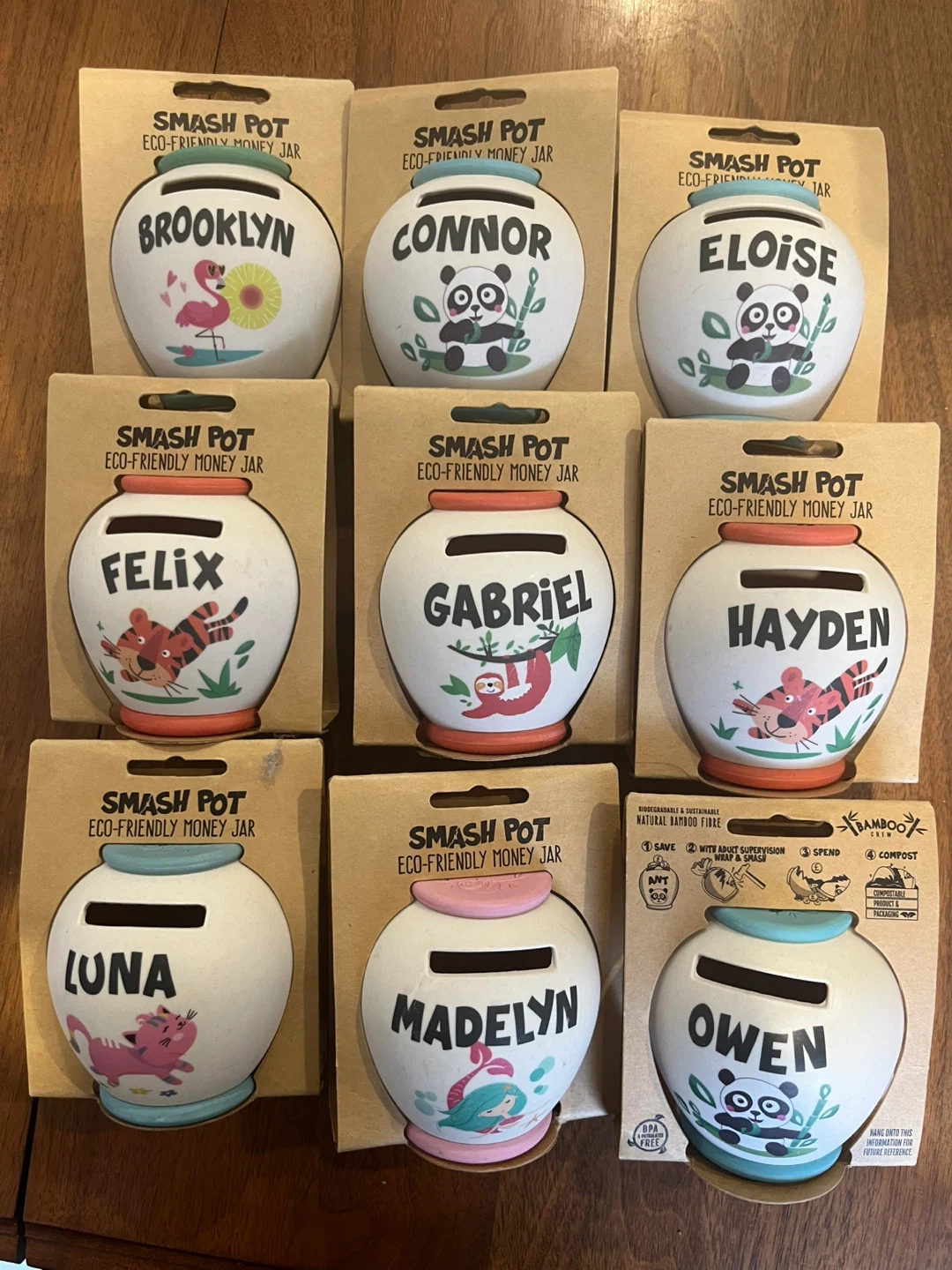 Bamboo money jars with name & animal, great for toddlers and young kids.