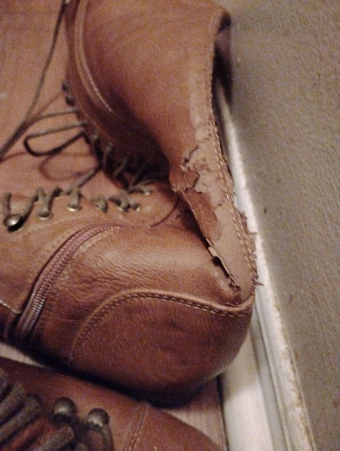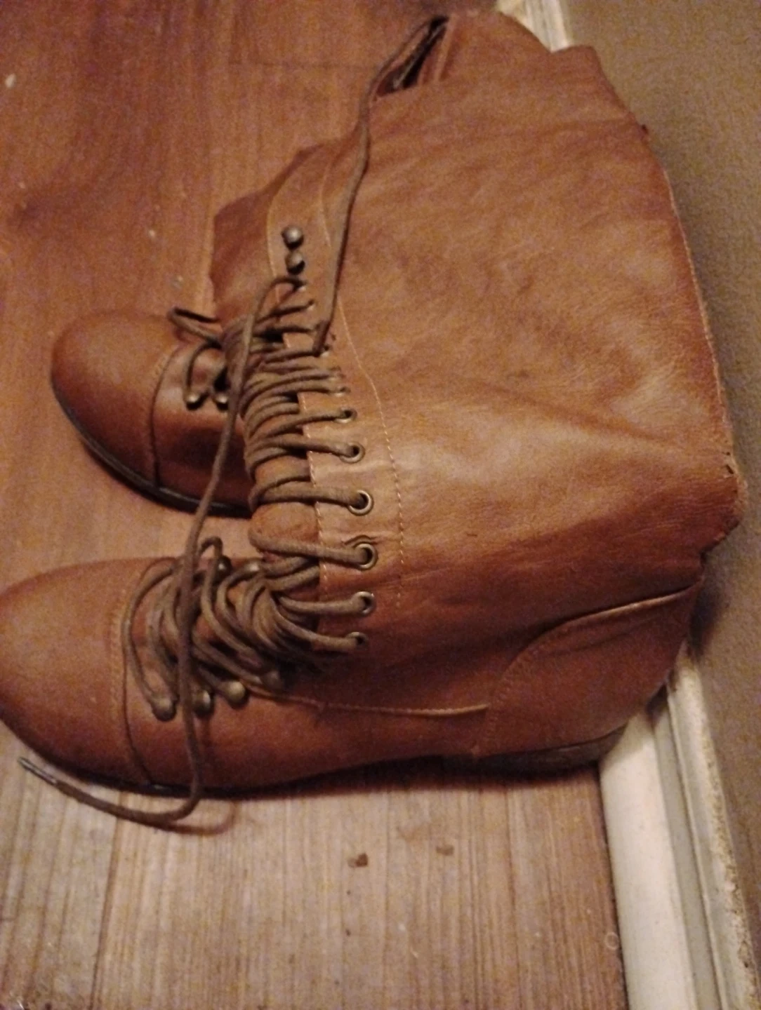 These brown faux leather boots feature a lace-up front and a side zipper closure. They have a comfortable round toe. Some wear and tear is visible on the heel, but they're still wearable. Will consider any interesting trade offers. Must pick up.
