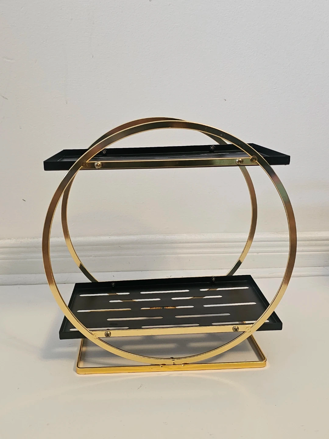 A stylish two-tier display shelf with black metal trays and gold circular accents. It's great for arranging your creams, perfumes and makeups.. Metal construction.