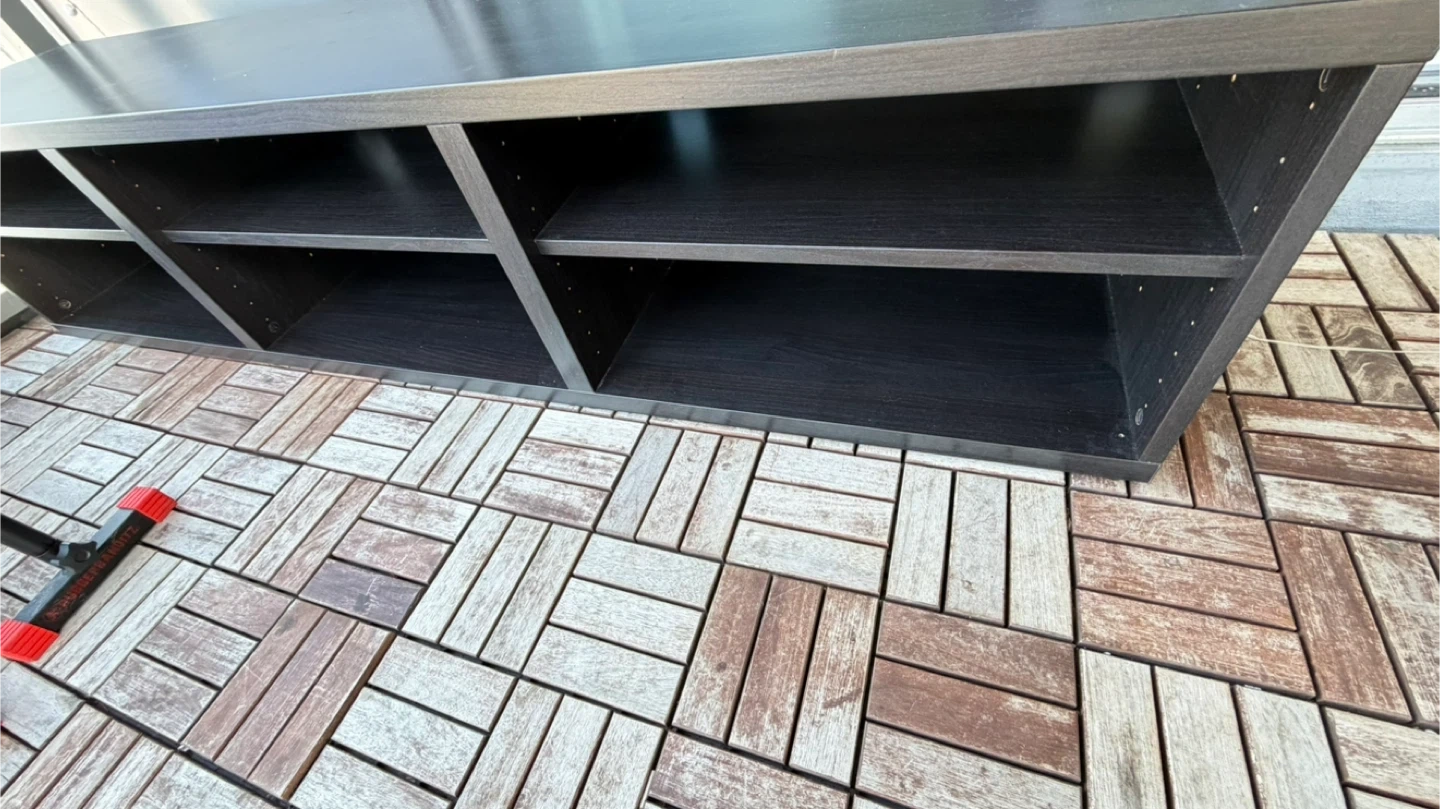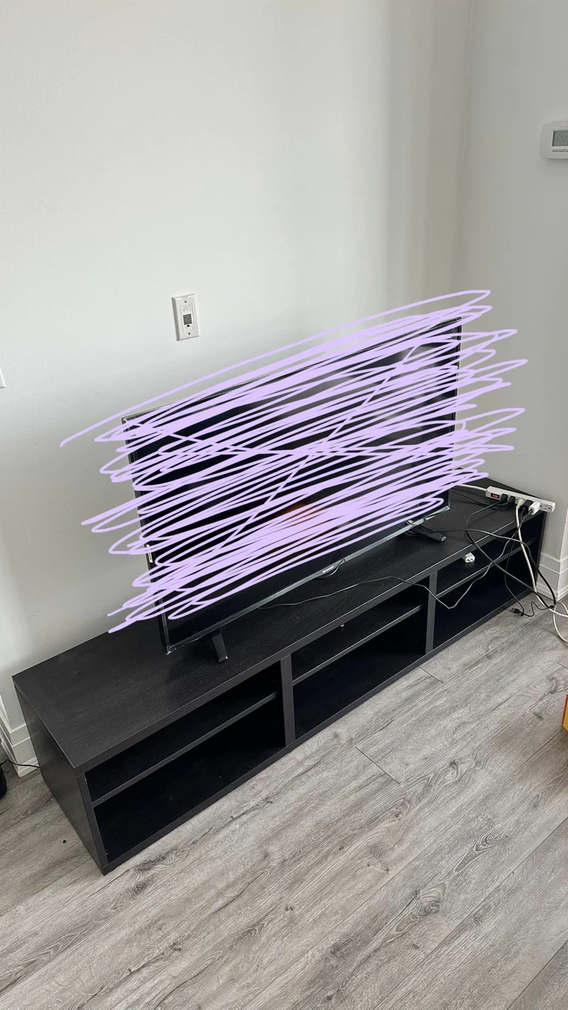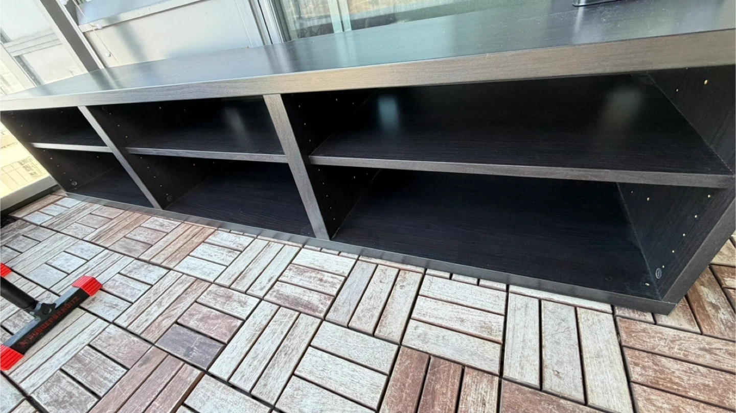 This black entertainment unit offers multiple shelves for storage or display. It's a versatile piece for your living room or media space. The unit is made of particleboard with a dark finish.