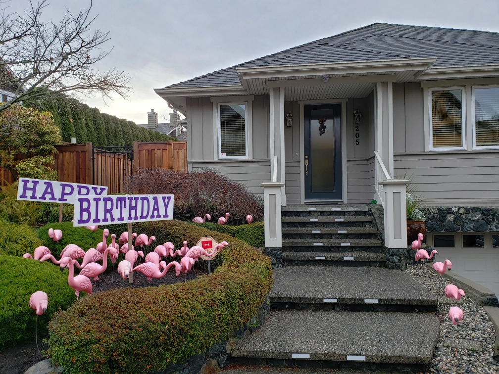 You can rent these pink flamingos and create the dramatic surprise on someone's birthday. With the attached metal stake on each bird, you can easily fill up the front lawn in just 15 minutes. You can do that at your own time, either go under cover at night or during the day time.
