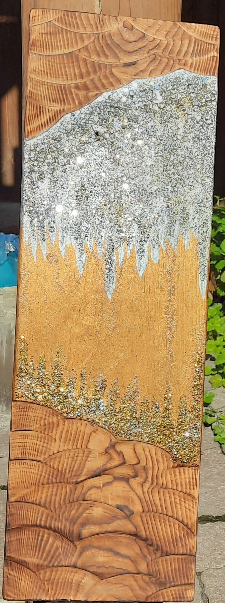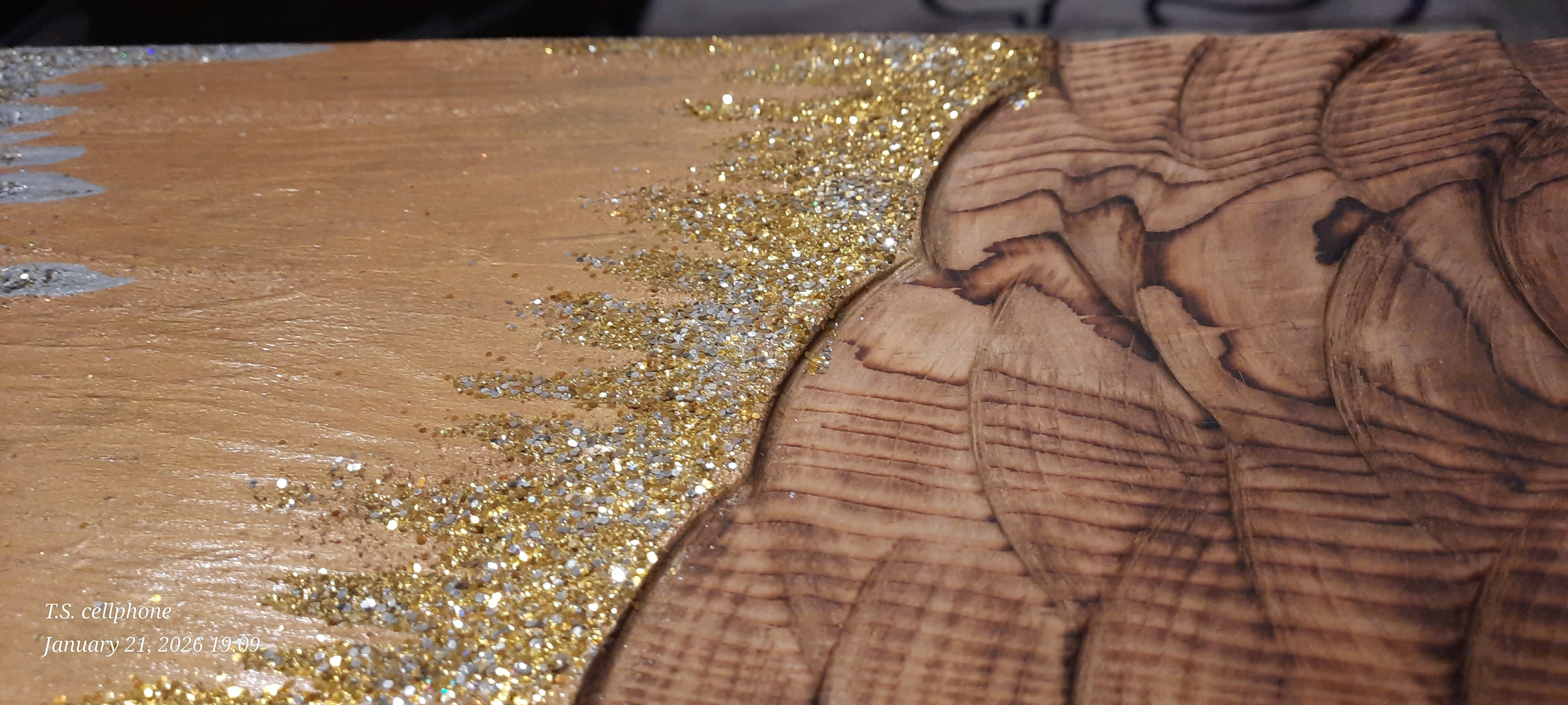 Selling a unique piece of handmade art! It features a combination of natural wood grain and sparkling glitter accents. The piece has a warm, golden hue mixed with silver glitter, creating a beautiful contrast. Perfect for adding a touch of sparkle to any room!