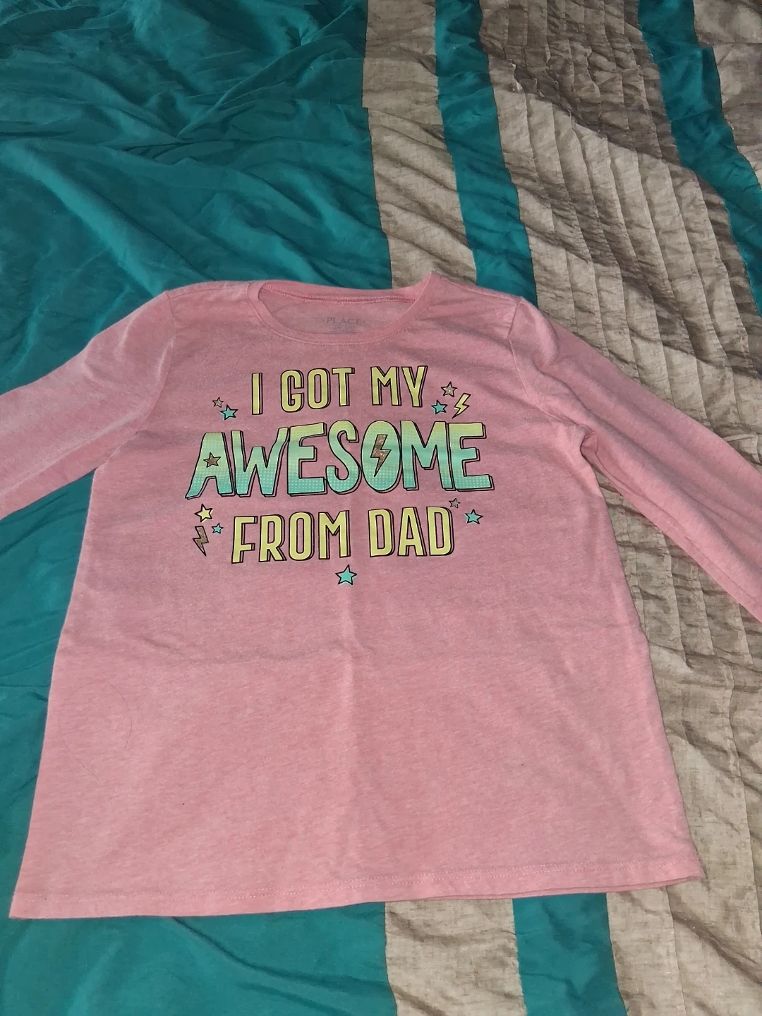 Here's a cute pink long-sleeve shirt from The Children's Place! It's a size L (10/12) and in great condition. The shirt has a fun design that says "I Got My Awesome From Dad". Perfect for your little one!