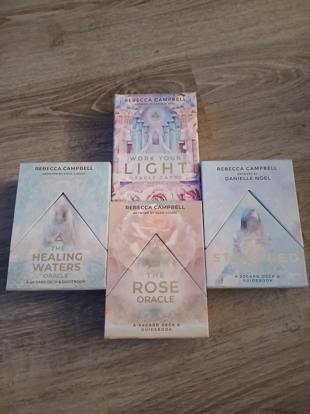 This listing include 4 Rebecca Campbell oracle card decks. Work Your Light Oracle, The Starseed Oracle, The Healing Waters Oracle and The Rose Oracle. All come with guidebook and all cards in tact. Beautiful artwork.