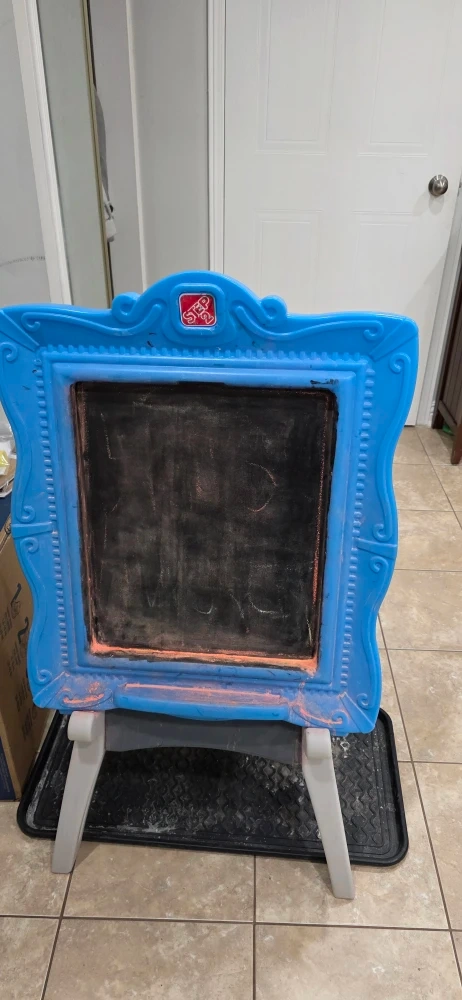 This is a blue Step2 easel. It has a chalkboard surface and a tray for art supplies. It's great for little artists! and development of kids through education, art and academics