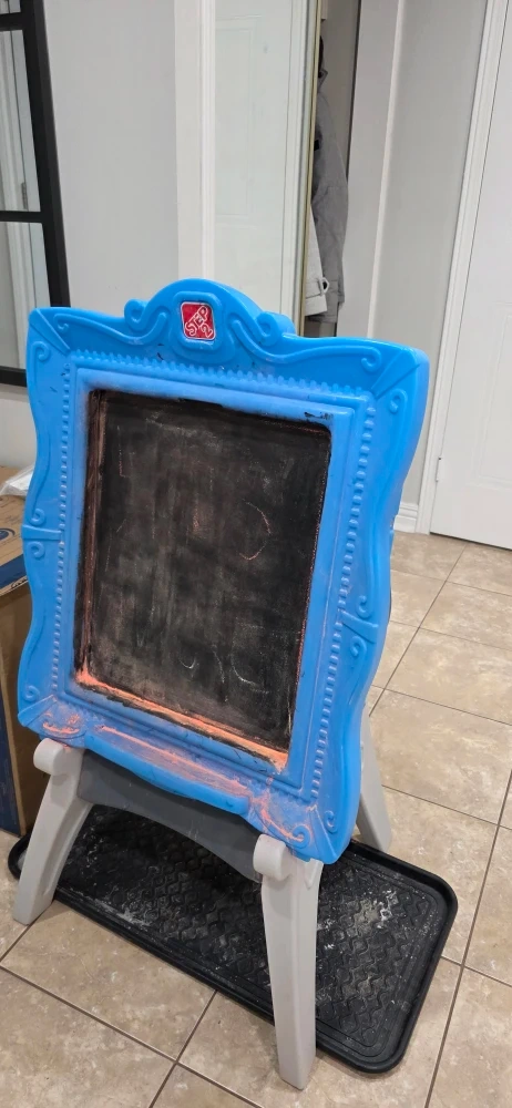 This is a blue Step2 easel. It has a chalkboard surface and a tray for art supplies. It's great for little artists! and development of kids through education, art and academics
