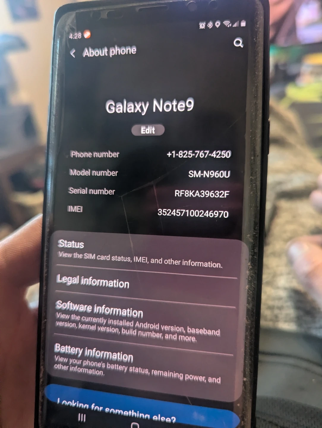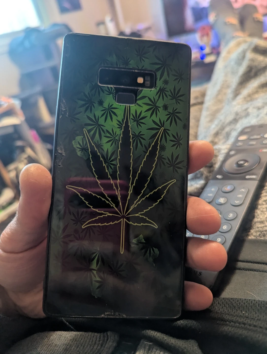 This is a Samsung Galaxy Note9 smartphone. It's a reliable device with a unique cannabis leaf design on the back. Perfect for everyday use and entertainment!