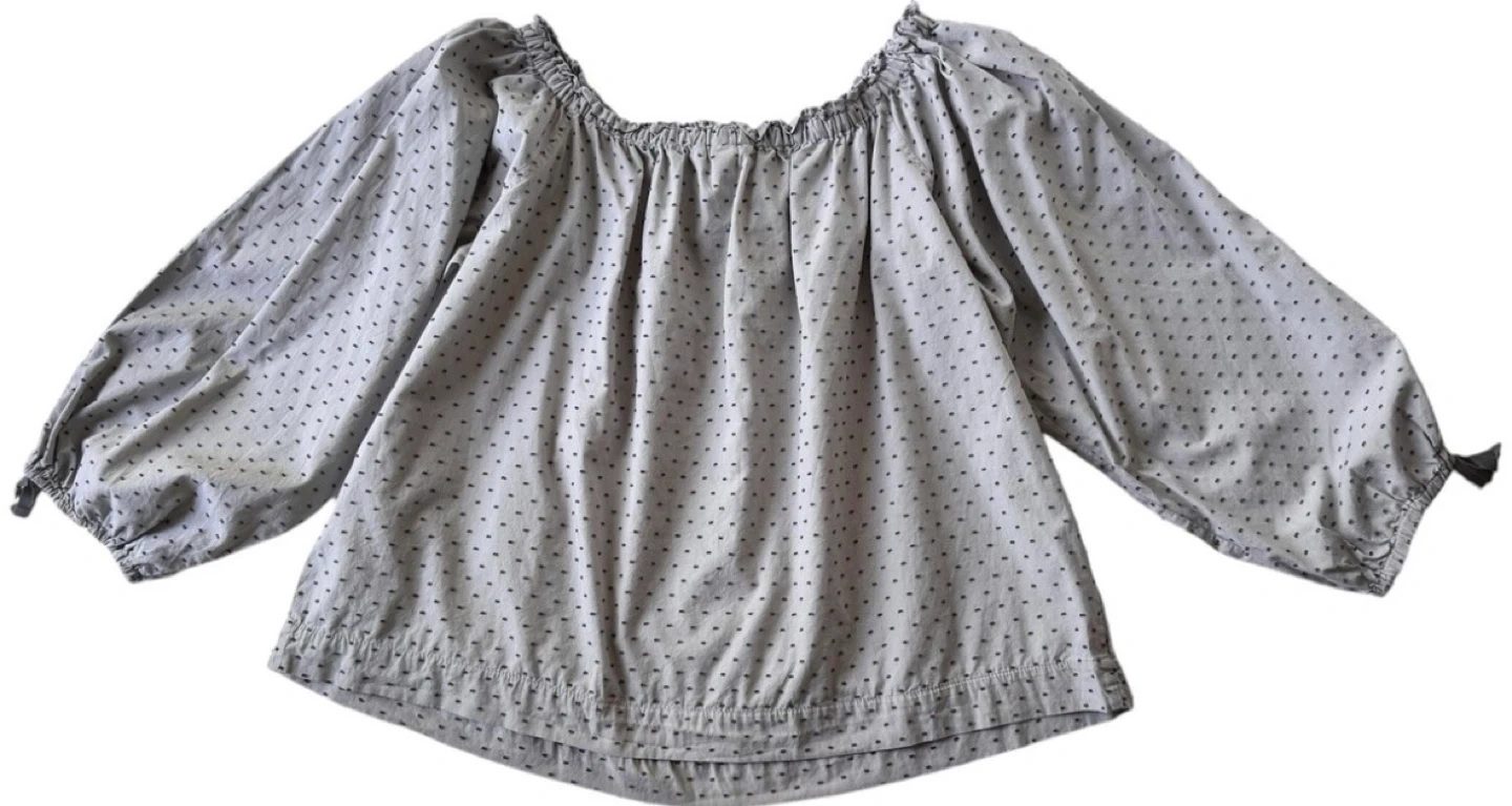 Blusa con hombros descubiertos de Victoria’s Secret. Es un color gris con una pequeña impresión de puntos por todas partes. Cuenta con un escote ahumado y detalle de corbata en el busto ,talla L. $7