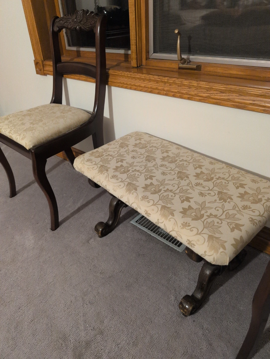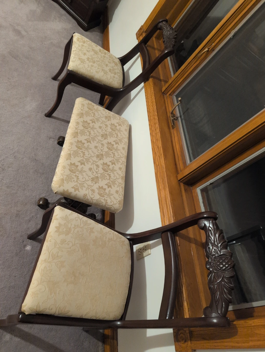 This set includes three upholstered chairs with a floral pattern fabric. The dark wood frames have carved detailing on the backrests and legs, adding an elegant touch. They appear to be from the early to mid-20th century. This set would suit a dining room or entryway.