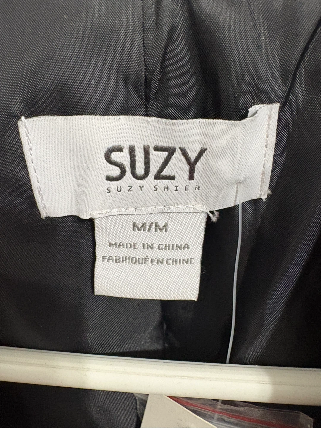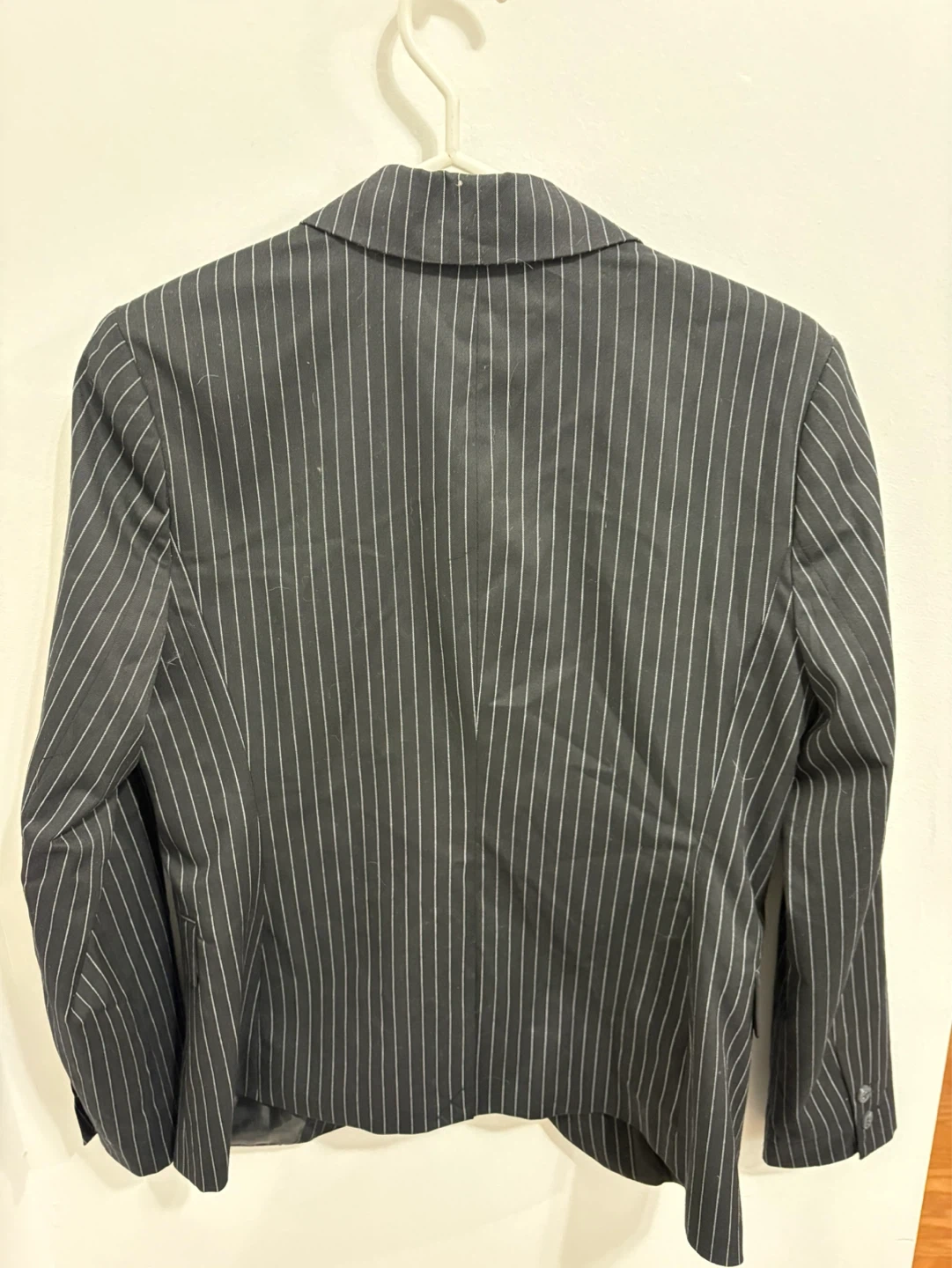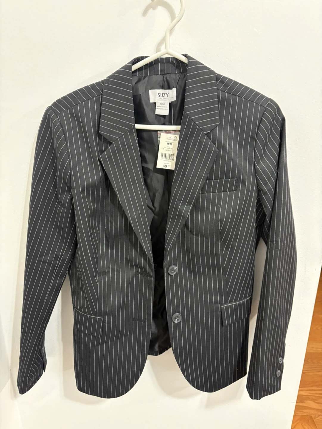 A charcoal grey blazer with white pinstripes from Suzy Shier. It's a size M/M and made in China. This jacket is perfect for adding a touch of professionalism to any outfit.