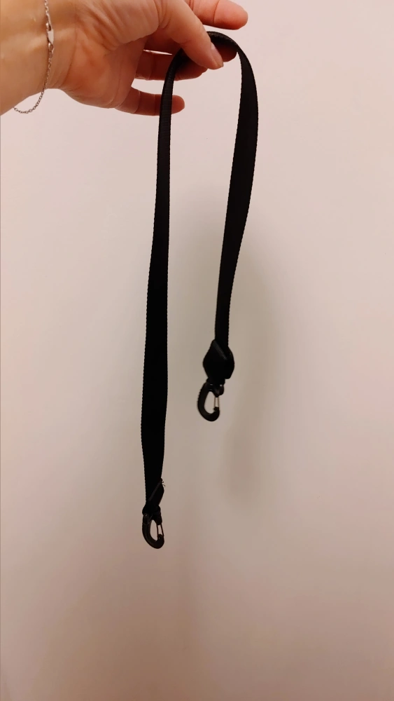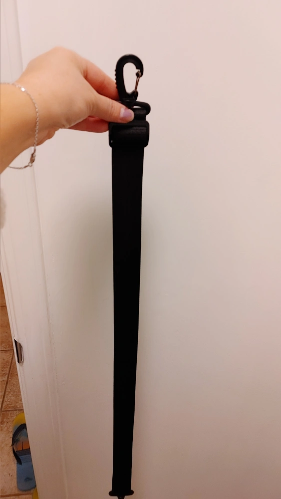 This is a black strap with two plastic carabiner-style clips. It features an adjustable buckle. The material is durable nylon webbing. It's useful for carrying bags or attaching items.