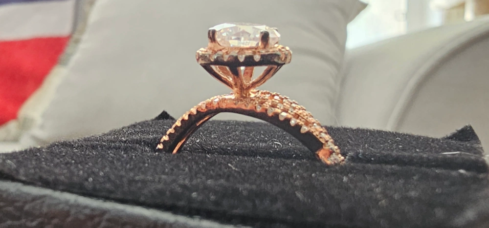 Stunning rose gold plated sterling silver ring. Features a large halo-set centre CZ stone and smaller stones along the band. 925 stamped inside the band. Some tarnishing on the band but never worn.