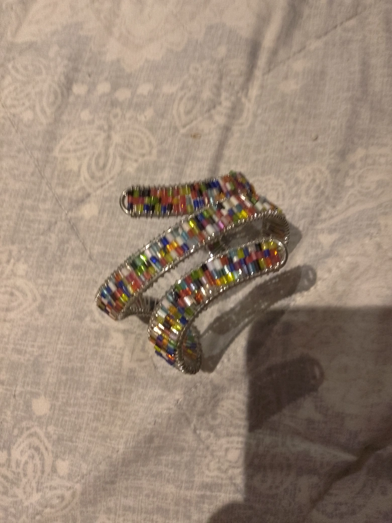 A lovely bracelet, decorated with a pattern of coloured beads. It's in a spiral shape, making it easy to slide on your wrist. It's sure to make you feel relaxed when you wear it.