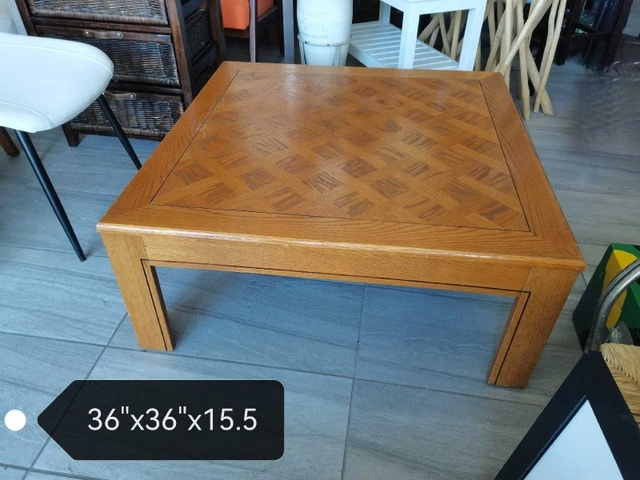 This square oak coffee table, measuring 36" x 36" x 15.5", is a beautiful addition to any living room. It's a used item and shows signs of wear, but it's still sturdy and has a lot of character. It is a great place to put books and have your coffee. The wood grain pattern is beautiful and adds a touch of elegance to any space. * Dimensions: 36" x 36" x 15.5" * Material: Oak