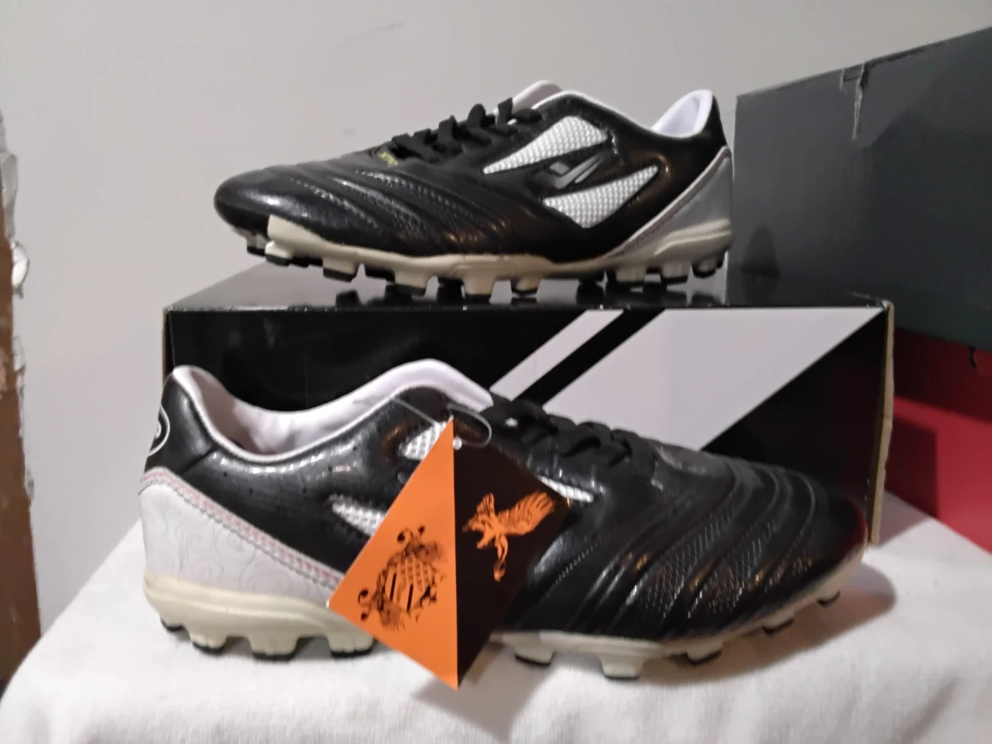Diadora soccer cleats in black and white. These cleats are designed for optimal performance on the field. They come with laces and are ready for your next game! Size:7.5