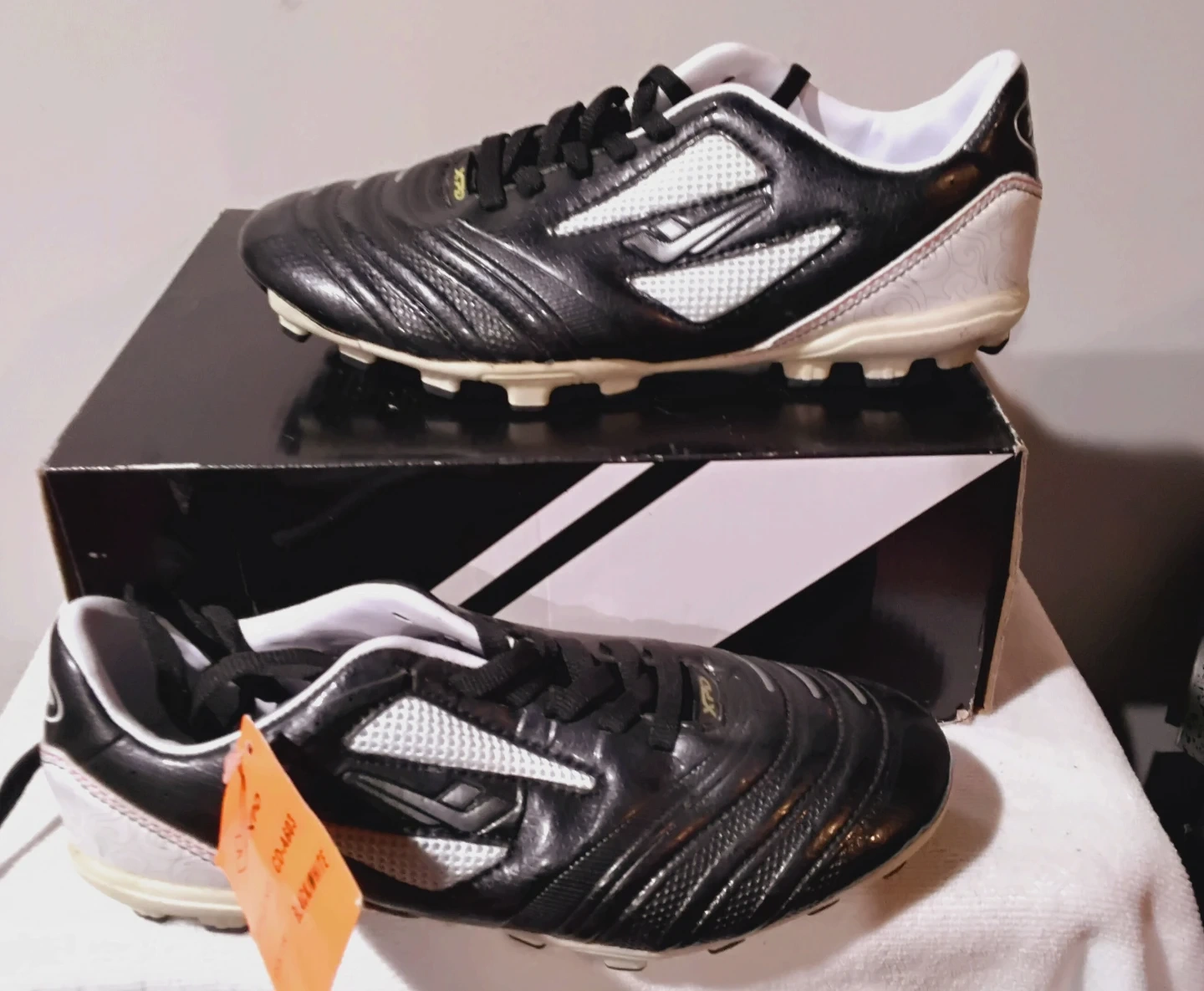Diadora soccer cleats in black and white. These cleats are designed for optimal performance on the field. They come with laces and are ready for your next game! Size:7.5